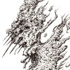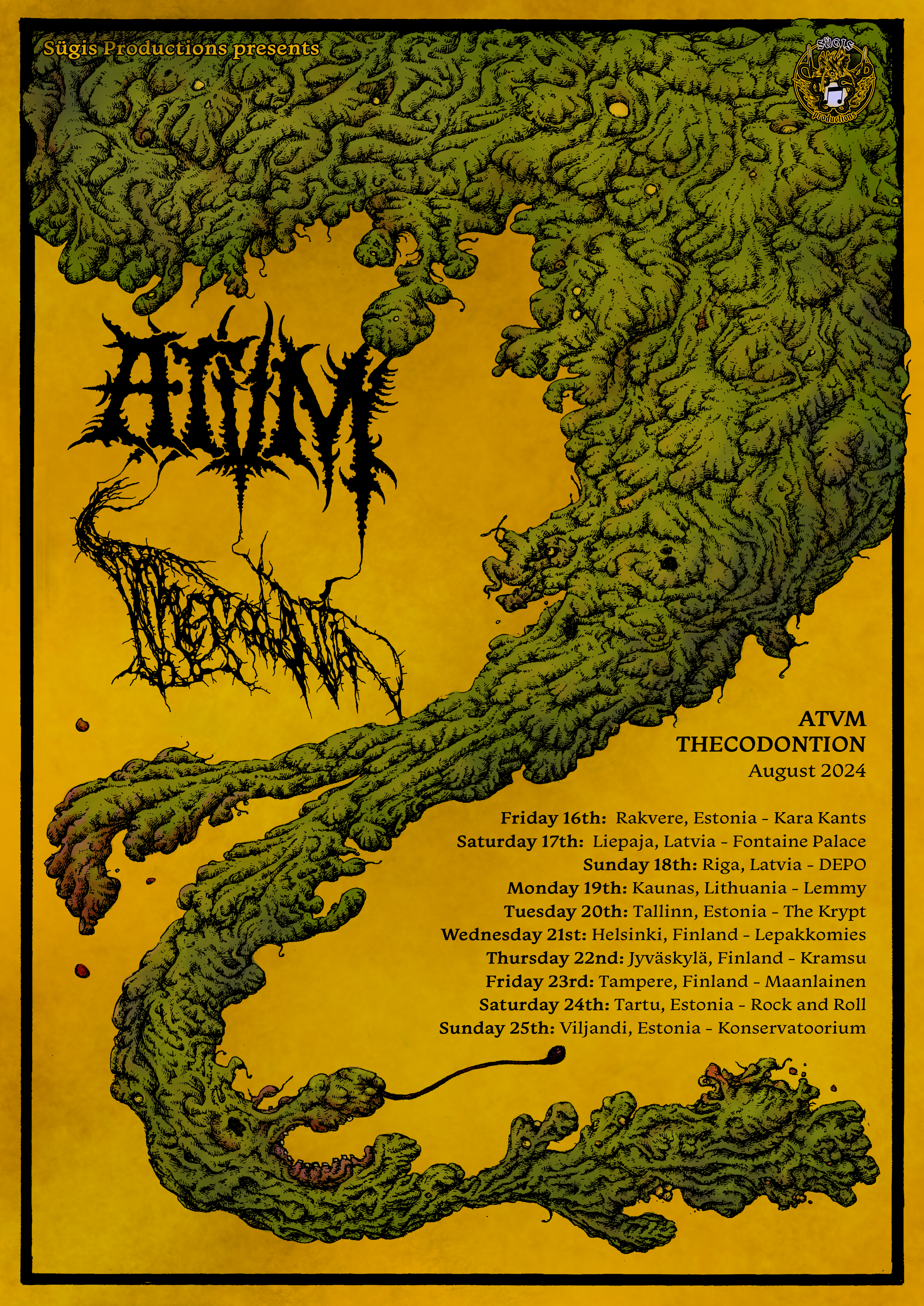 I was asked to do some fleshy inkwork for the Atvm / Thecodontion tour poster so I worked up this amorphous tendril to fit around the brief of ‘just make it something horrid’. Automatic drawing based loosely around leaving gaps for the information, then scribbled back into and embellished as I went and features jumped out at me. This was I think .05 unipin on paper, scanned in and coloured, and layered over some enamel spray marbling textures I had lying around.