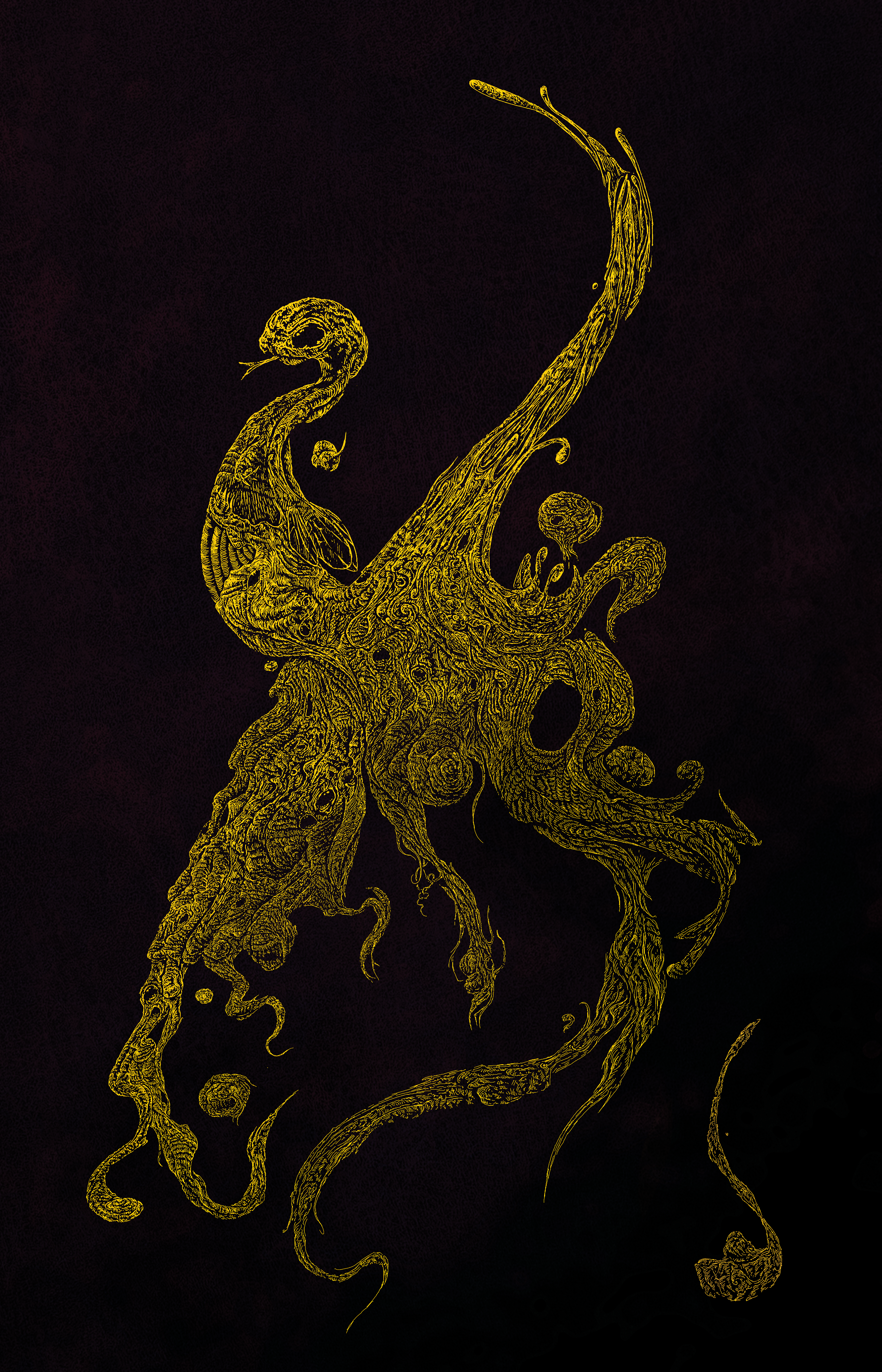 This was an early digital illustration, using photoshop to draw in yellow over a dark background, and I very much fell into the trap of the zoom function on this one. This lead to the super detailed texturing on the image below, and gave it a sort of abstracted bark/wood like texture that I think fits the music well. A lot of learning on this one in terms of brush shapes and textures and smoothing settings. The background was some open source leather texture I think.