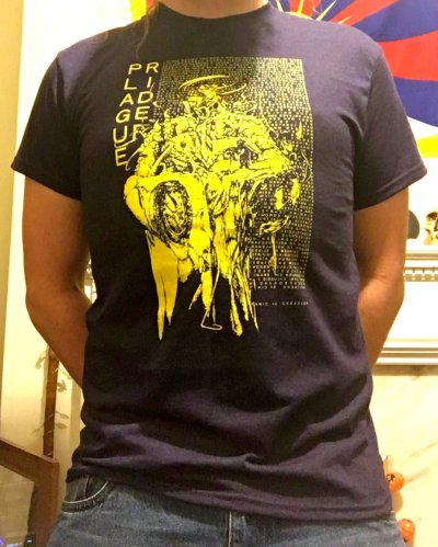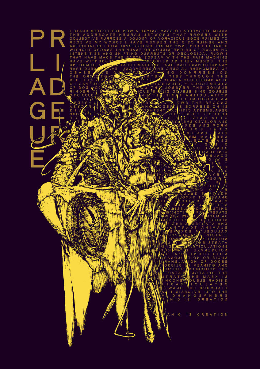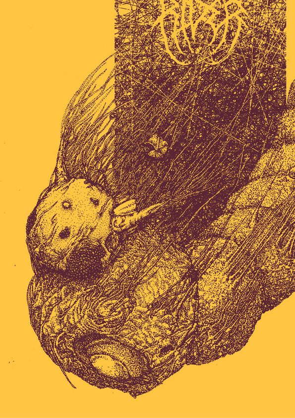 This design was based around the lyrics for Challengers Lecture, which in turn is based on Geology Of Morals from Deleuze and Guattari’s A Thousand Plateaus. The song itself is a sort of first person recounting of Challenger’s role in the chapter as he explains concepts of articulation and stratification, whilst also dissolving and deterritorialising himself. I was keen to get at the sort of frantic and ultra complex tone of both the song and its context, so the image below is a semi automatic drawing of Challenger at his lectern as he dissolves/disperses. I also wanted to play with using the lyrics as a graphic element, so they’re mirrored and placed behind the image digitally, with the final line left unaltered for emphasis. Ink on paper, scanned and printed in yellow on purple.