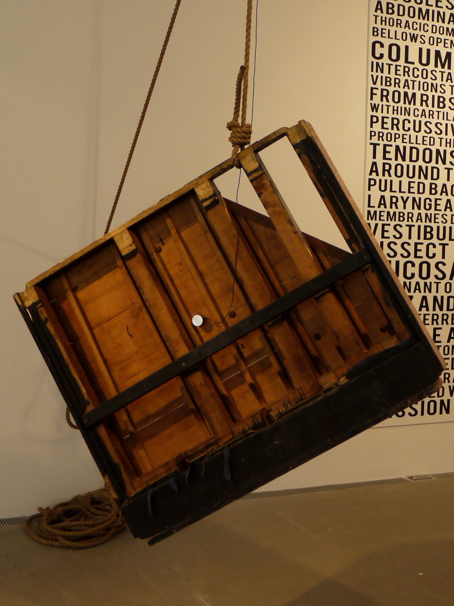 Colony was a follow on from the Gathering piece. I stitched together some more hessian cocoons, this time filling an empty office space with them, as they anchored themselves by their strings to all available surfaces. Instead of dripping fluid, these forms had speakers embedded within them, wired up to a number of cheap hi-fi systems hidden in the ceiling. These played a set of looped chimes like sounds, that were then spread spatially through the speakers embedded in the forms, creating a sort of aleatory sound piece by virtue of the differences in rest time and sync between the various hi-fi mechanisms.