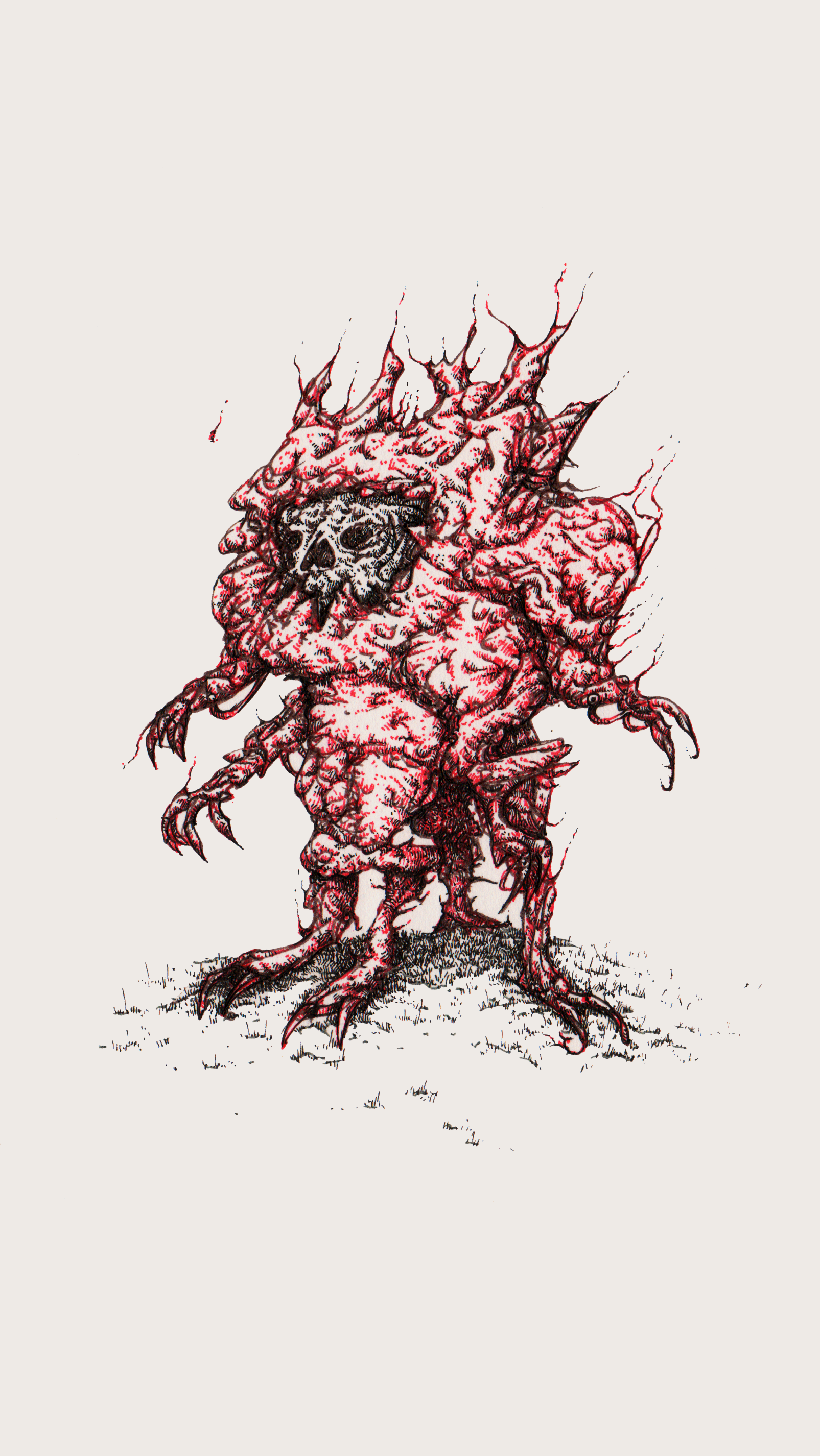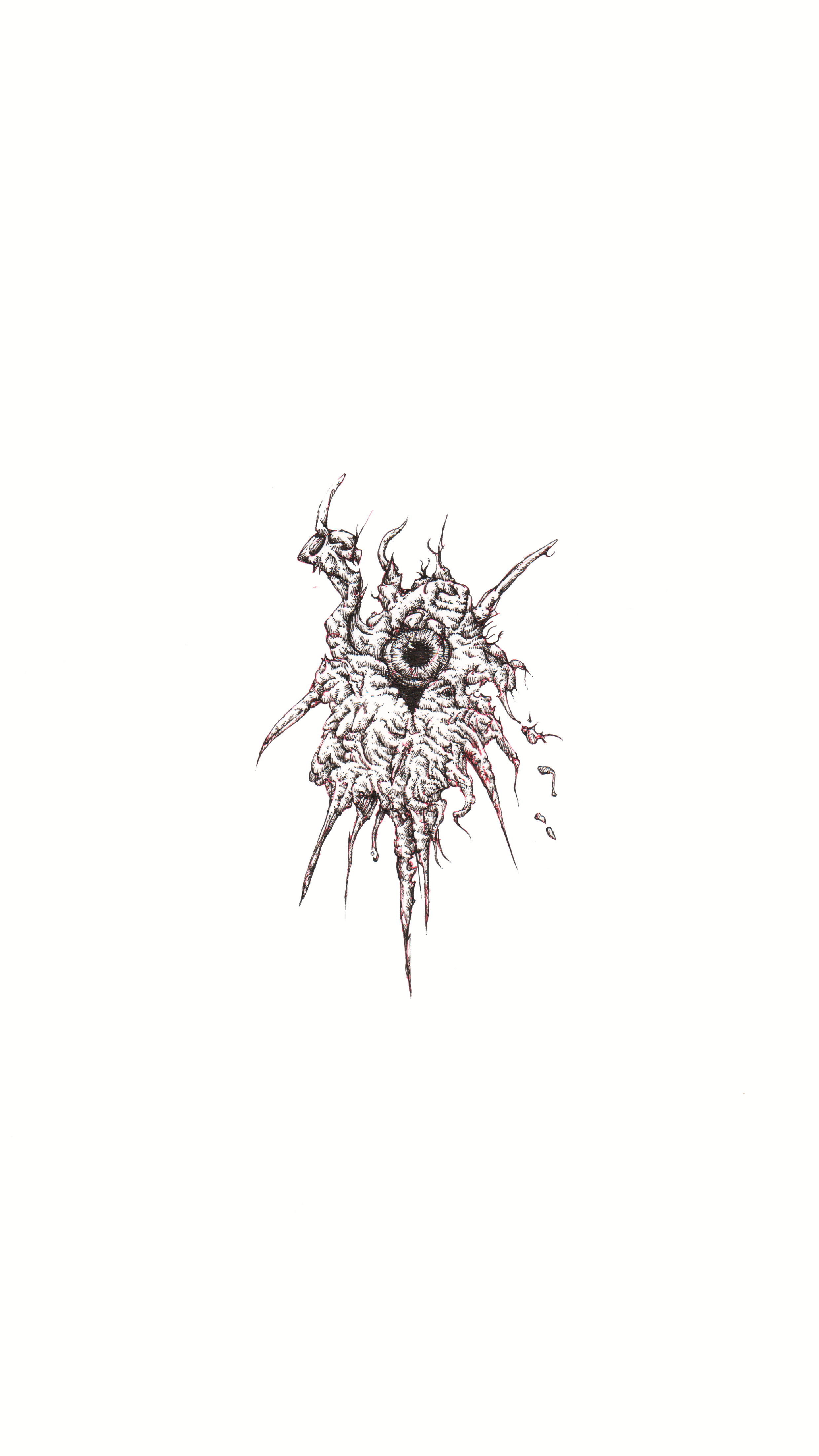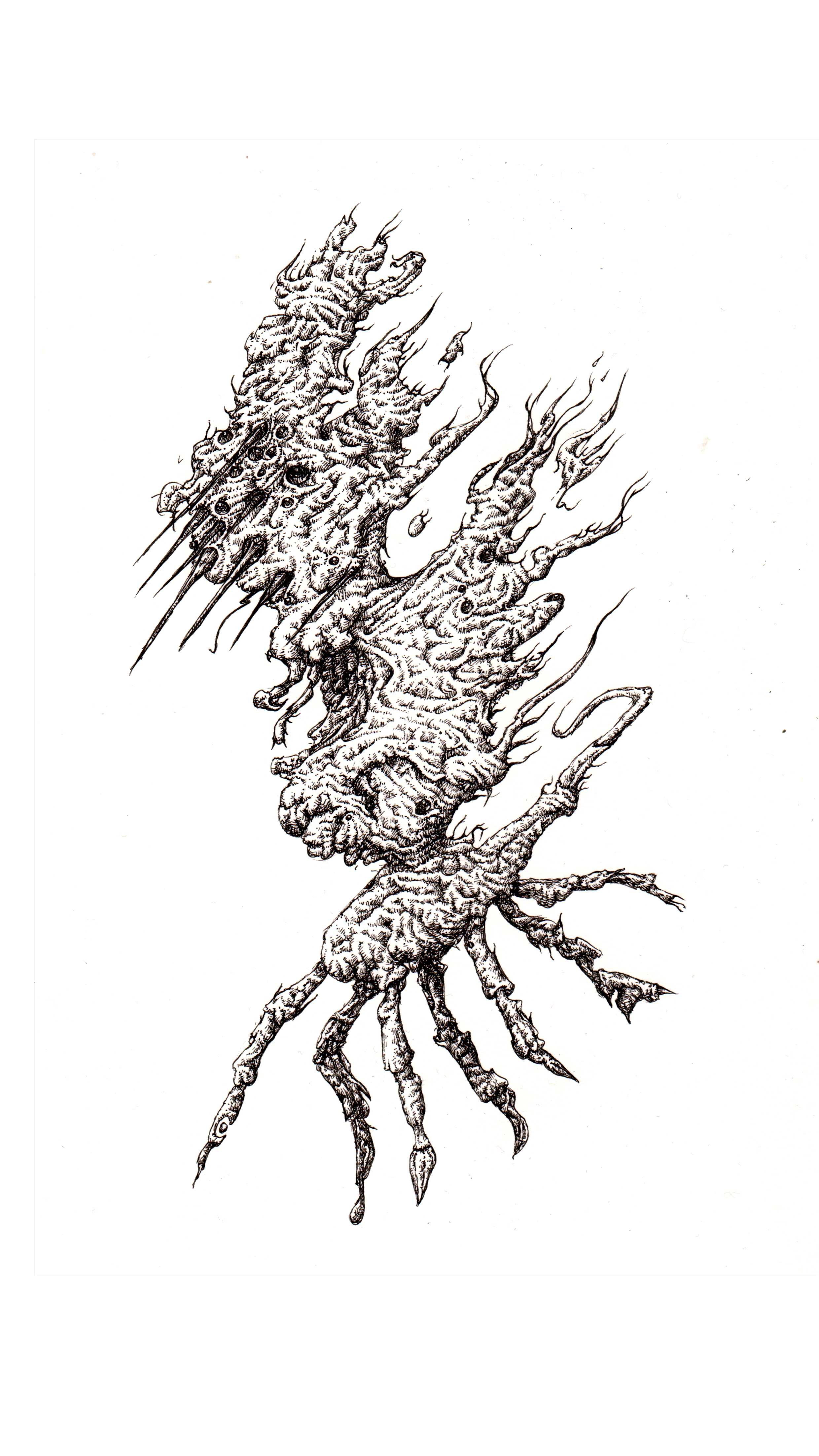 I’m pretty keen on the ol’ eldritch horror trope. Strange beings full of additional limbs and tendrils with non-sensical anatomy, fit the kind of detailed gristly drawing style that I tend to go for really well. The one below was a pretty extensive ink drawing in 0.05 unipin on paper. Automatic shapes developed and worked into. Pretty hefty bit of Ian Miller and old Games Workshop material underpinning a lot of this.