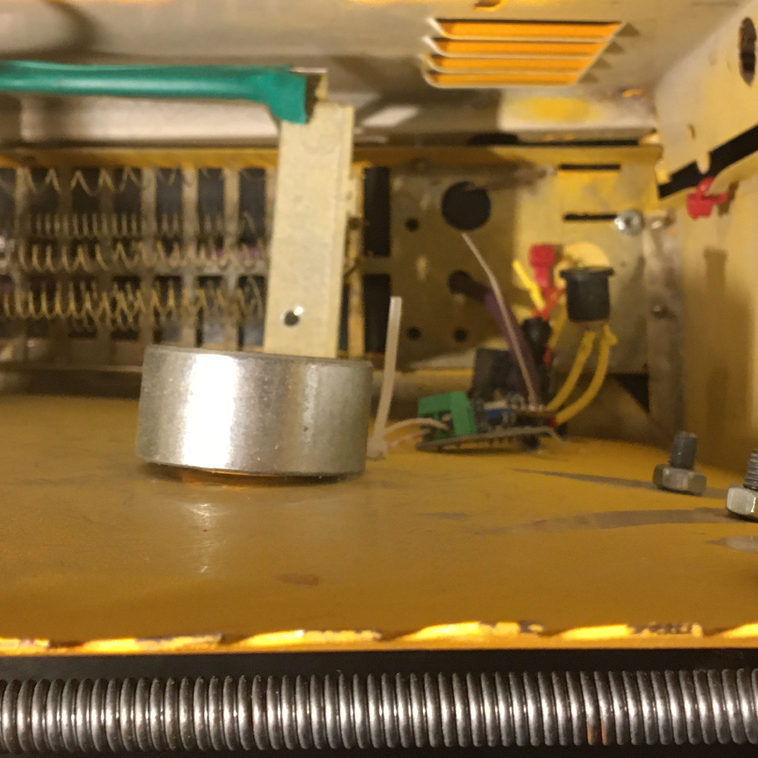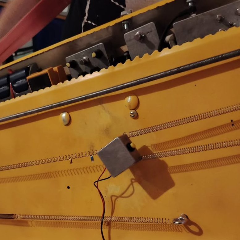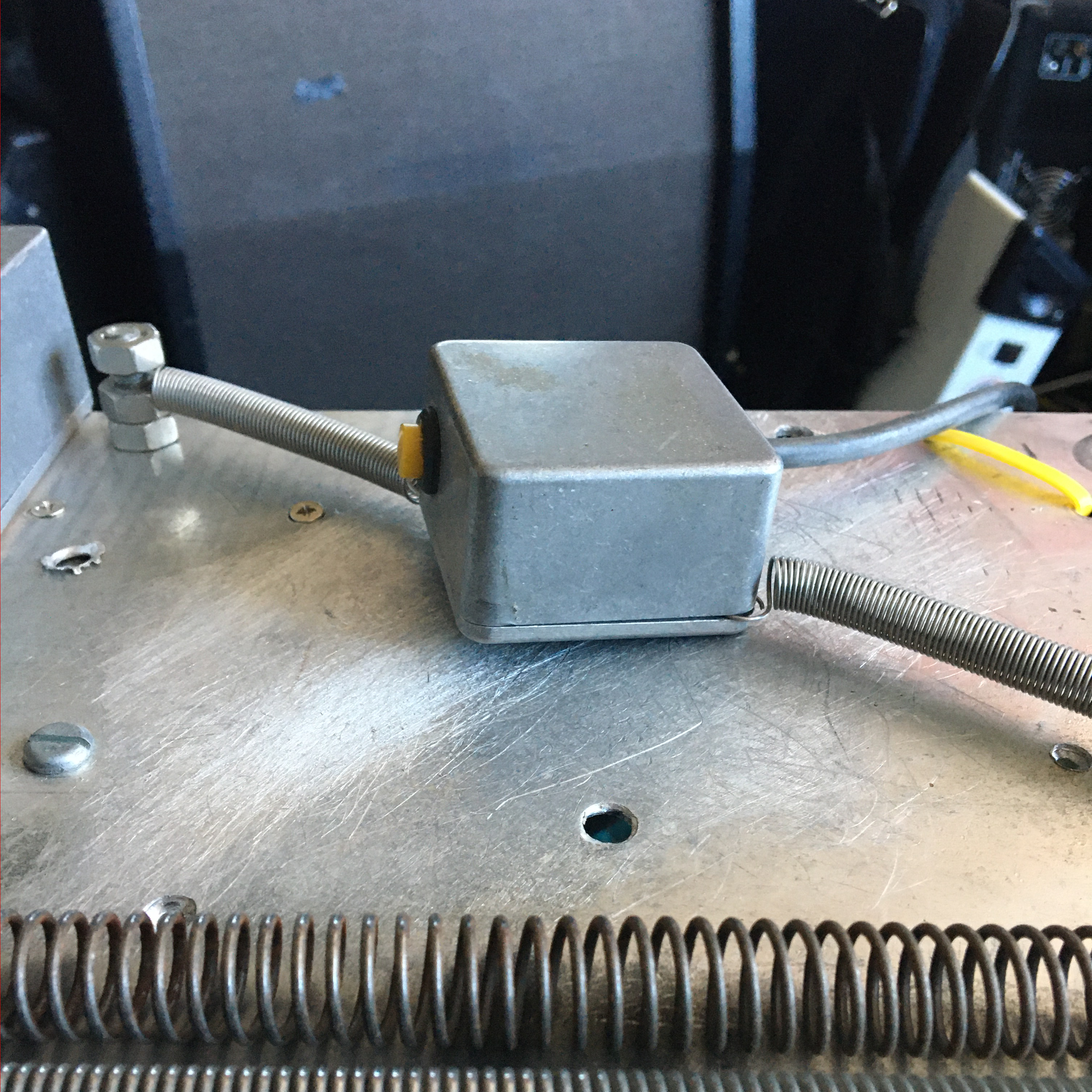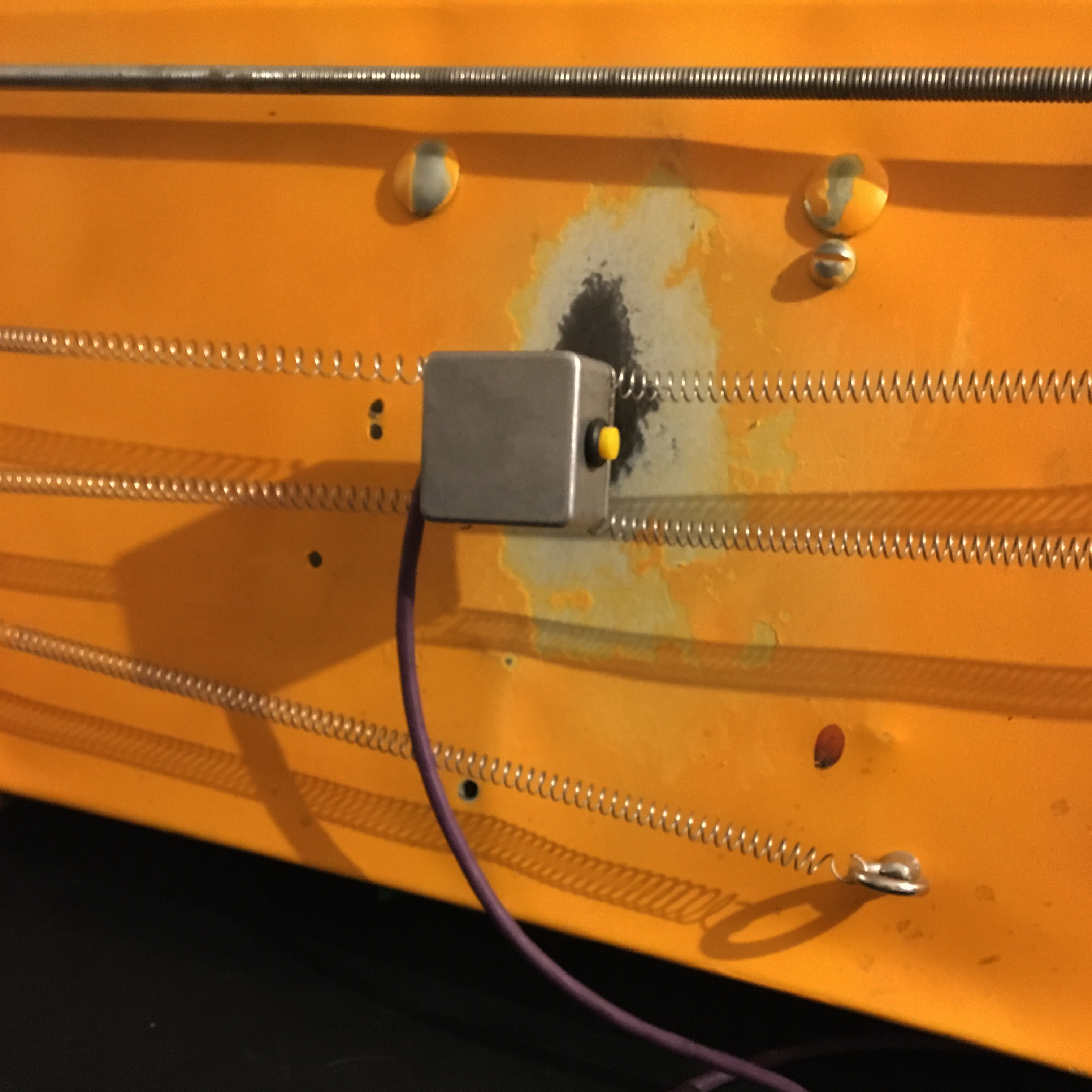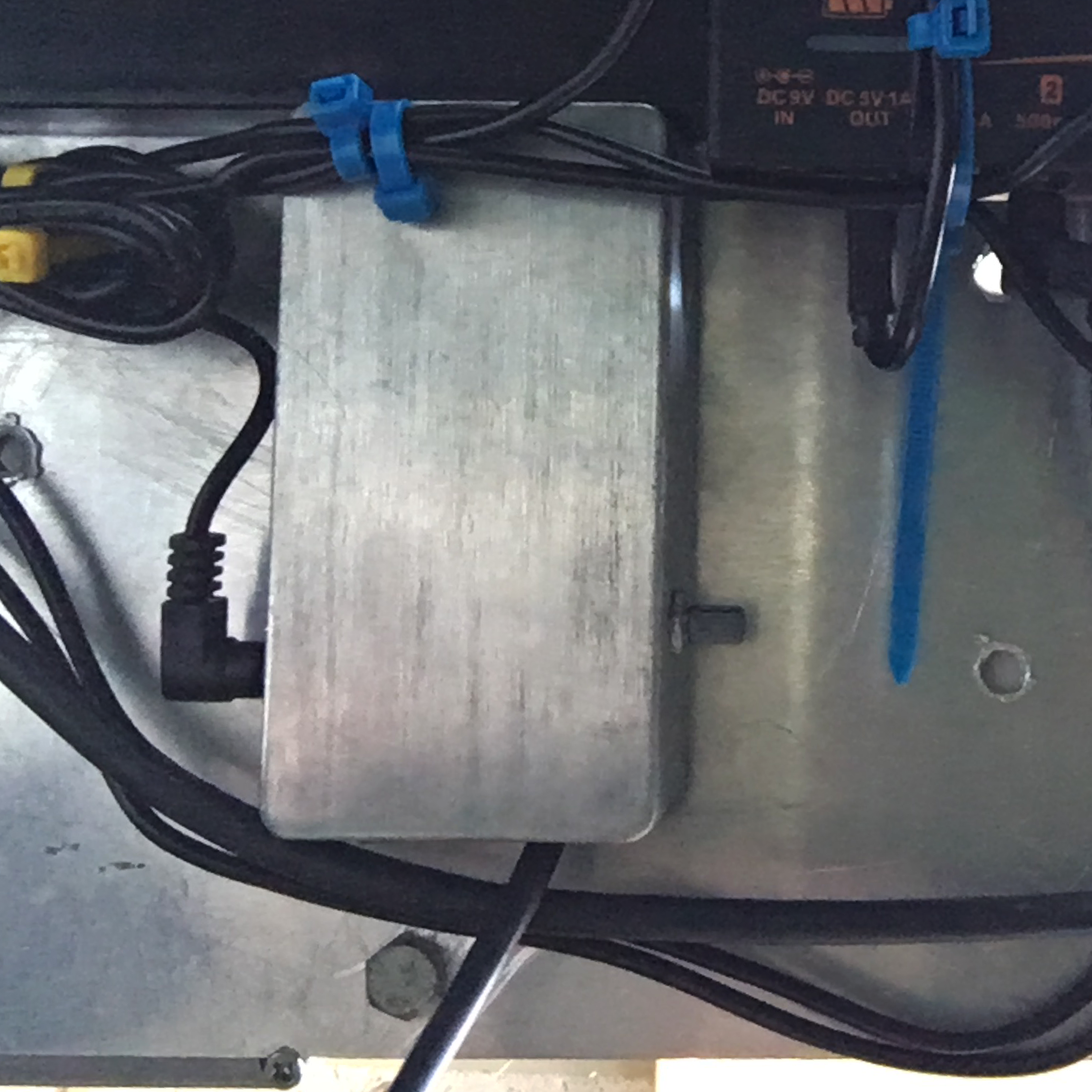 The principle behind the feedbackers is pretty simple. In the small box is a piezo disc, wired up to a button that connects it and sends signal down to a small amp, which in turn amplifies that and sends it out to a contact transducer that vibrates whatever surface it’s bolted to. This means that if you touch the active piezo box to the surface the transducer is attached to it generates an direct feedback loop through the surface. Add some scrap bolts into that piezo box and enough room to scrape the piezo box around and you get a semi playable instrument that can generate almost guitar feedback sounding scree. Leave the device on a more sonorous surface with a bit of distance and you get drones. I run one of these on the Plague Rider rig and one of the radiator rig at the moment.