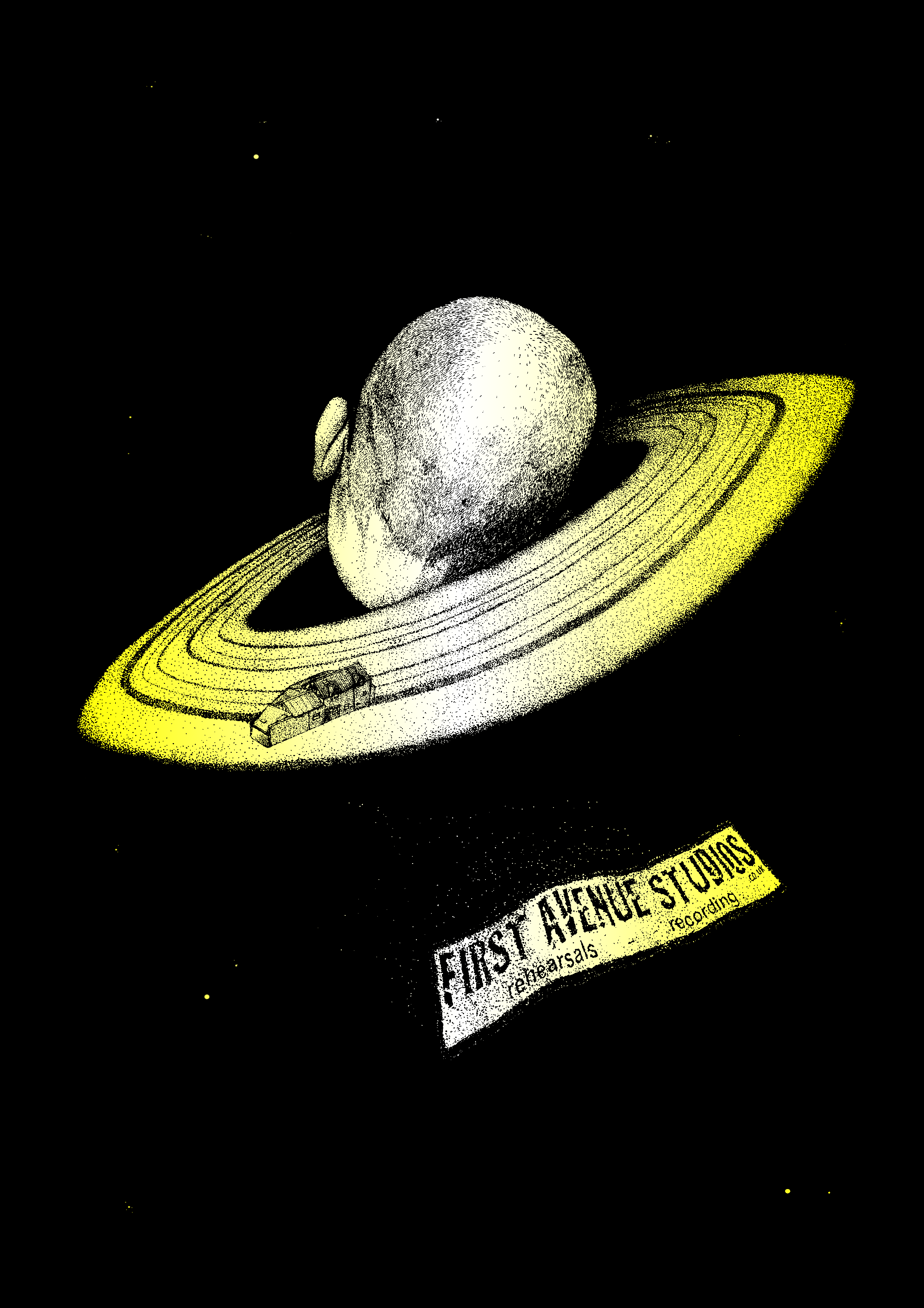 First Avenue studios is the place where nearly all of my projects started out, and is my second home in a lot of respects, so I was pretty chuffed to be asked to sort them out a T-shirt. The design for this one is a bit of a niche in-reference to David Curle who runs the studio, and the view of the back of his head that we’re all so used to while recording our various projects. So the design became Dave’s head scaled up to planetary size and the First Ave building in orbit, with the logo/sign detached and speeding toward the viewer. This was done in ink dot work on paper and printed with a white to yellow fade effect.