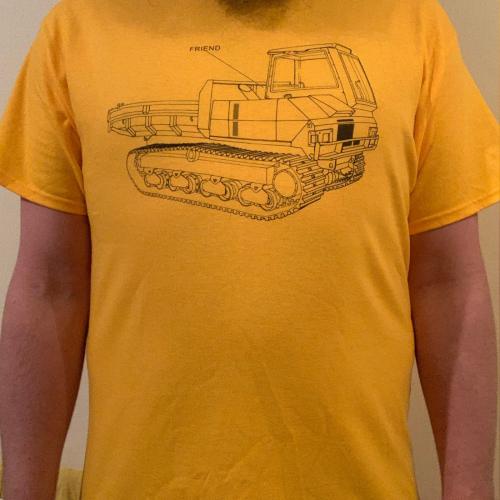 The design for this started out as a digital tracing from the album art in an attempt to get clean and precise lines, but it ended up taking on a sort of uncanny angular quality, so I redid it in ink to get at a more old style schematic kind of set up. Initial rough tracing over the base digital lines printed out in pale blue, and slowly replaced with more drawn ink as I got the dimensions sketched out and accurate. Digital text added and then printed onto yellow T-shirts via Discordant Sun, and I think screen printing really pulls that kind of linework together with the text nicely.