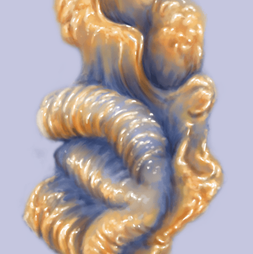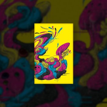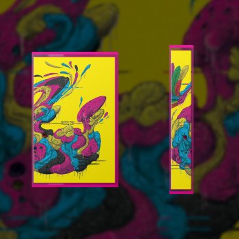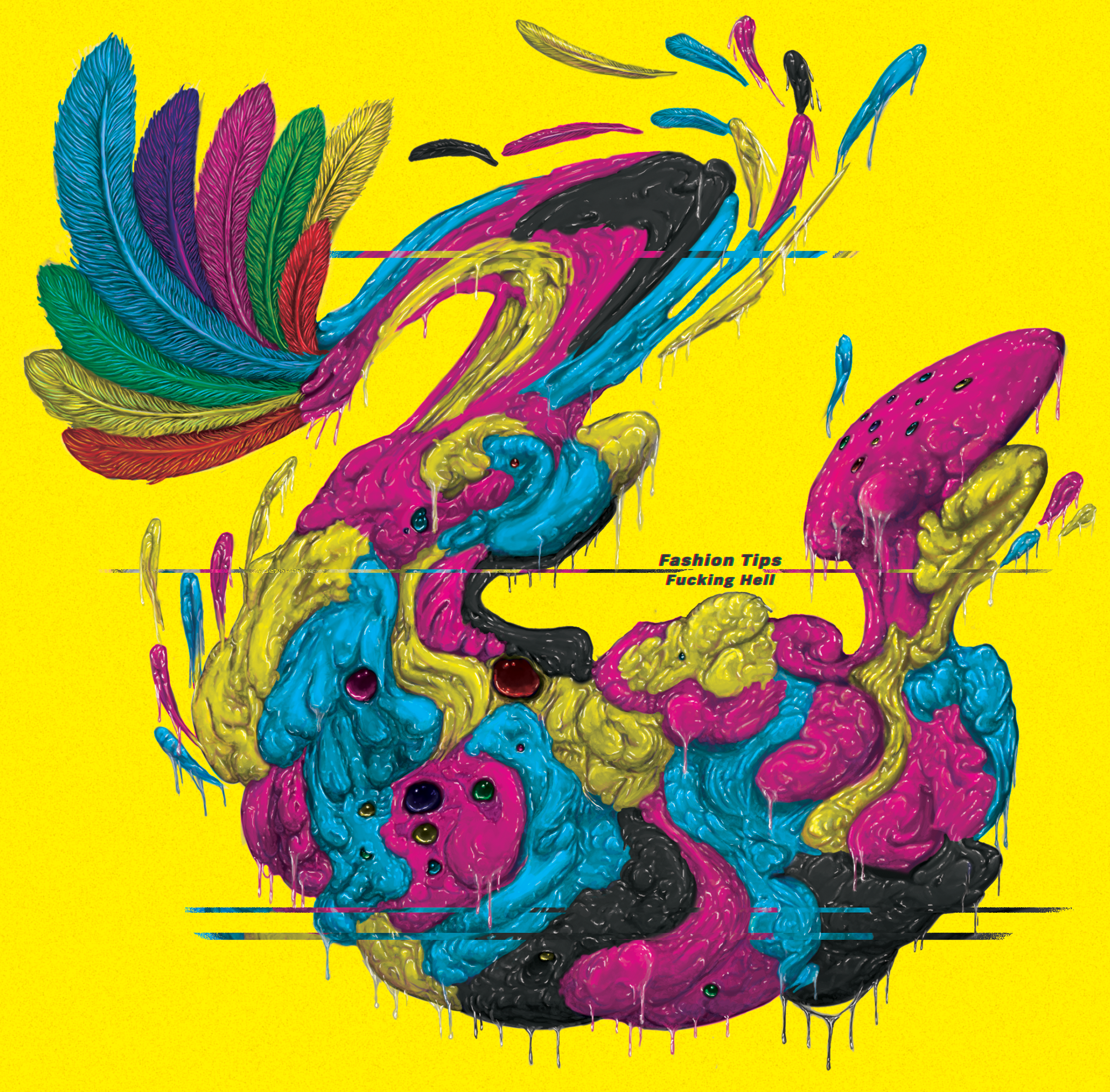 The tagline for early Fashion Tips material was ‘the grossest pop songs’ so for their debut EP, I wanted to get at something garish and lumpen but also super bright. There’s a line in Standing O that goes ‘We shake our cryptic plumage to an anxious rhythm’ and that’s what drew the ideas together. I planned around the tail feathers and then drew the lumps out from there, populating it with gemstone ‘eyes’ and colouring portions in CMYK colours for maximum brightness on printing. A bit of selection and ‘glitching’ effects finished it off and tied the title in on the layout.