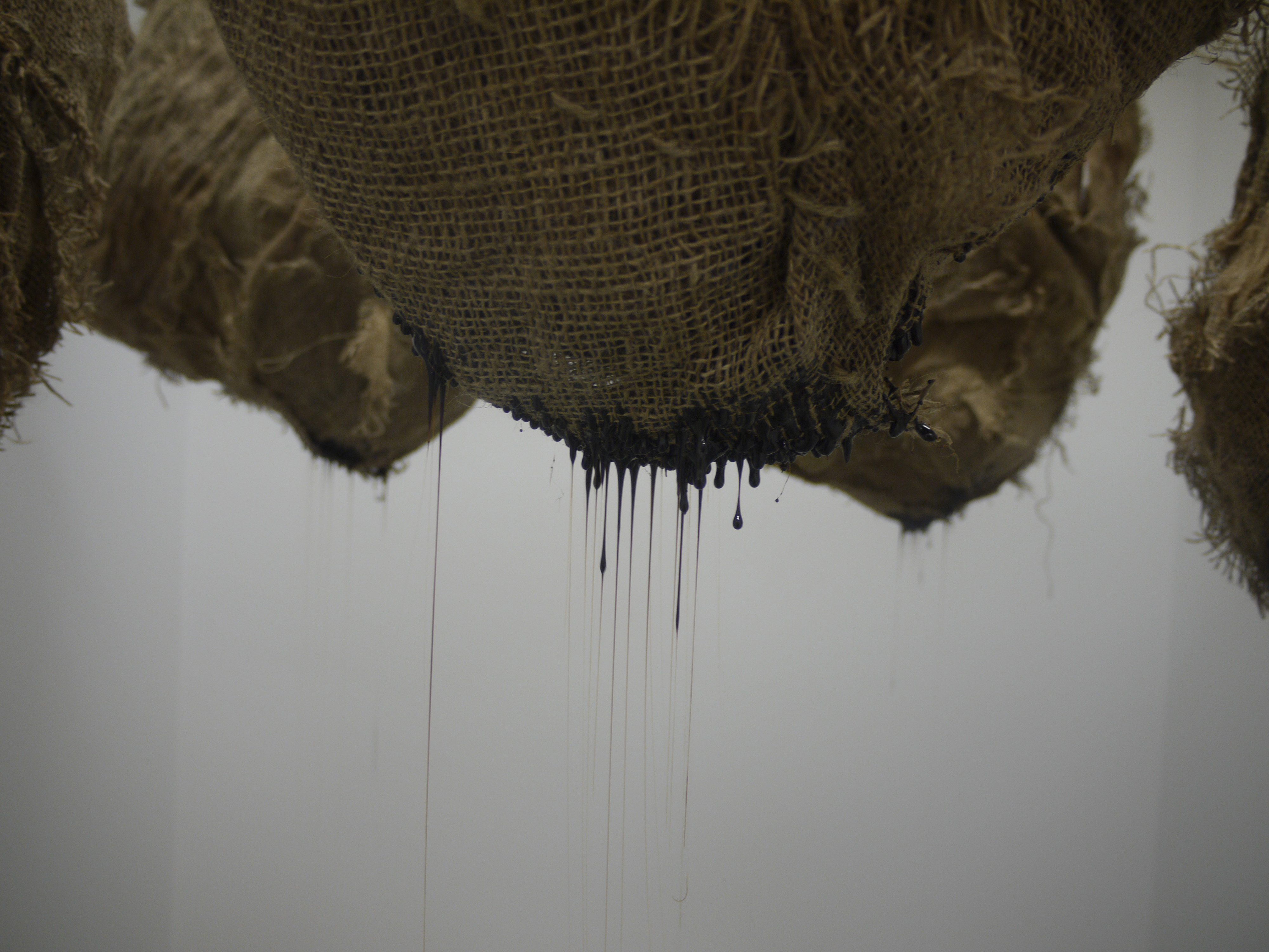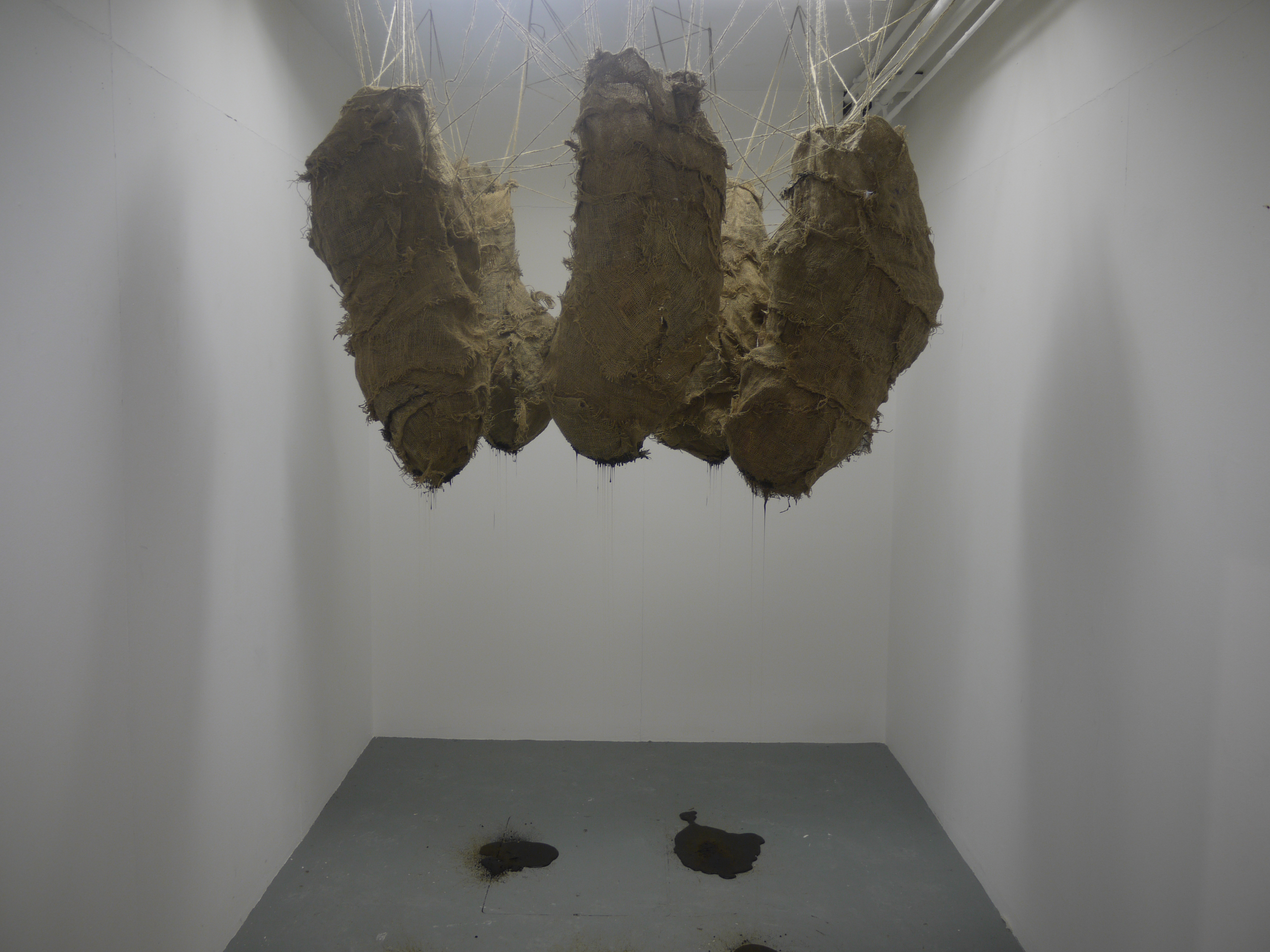 Gathering was put together from cocoon-like forms sewn together from roughly torn hessian. These were displayed twice, and in both cases I had them suspended from the ceiling around strip lights, as if they’d grown around or where attracted to the fluorescent tubes. Packed with newspaper and with a tin of treacle upended in the innards of each one daily, they slowly oozed their ichor into the space below them across the course of the exhibition, giving the illusion of some kind of slow life.