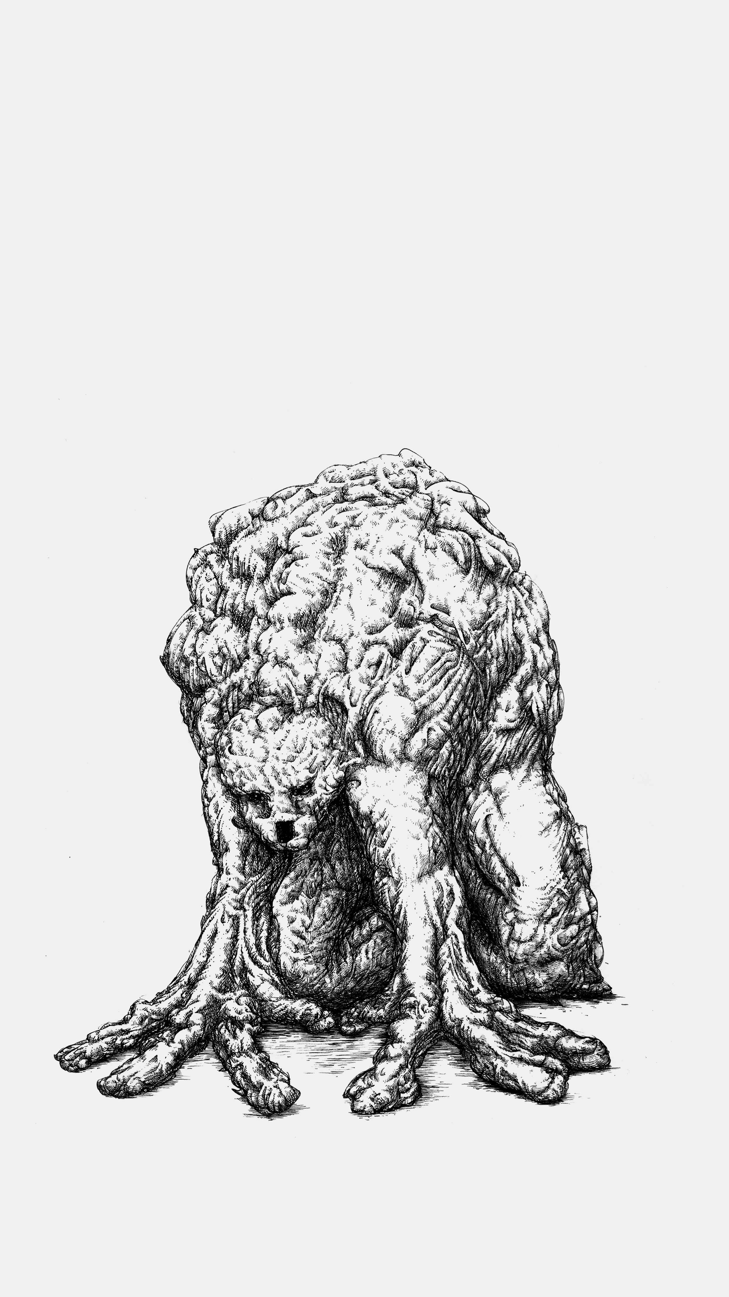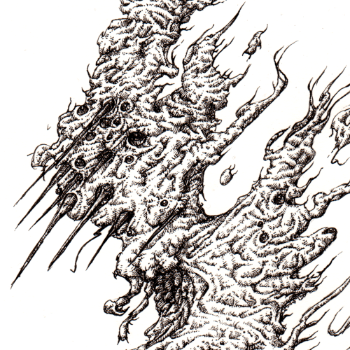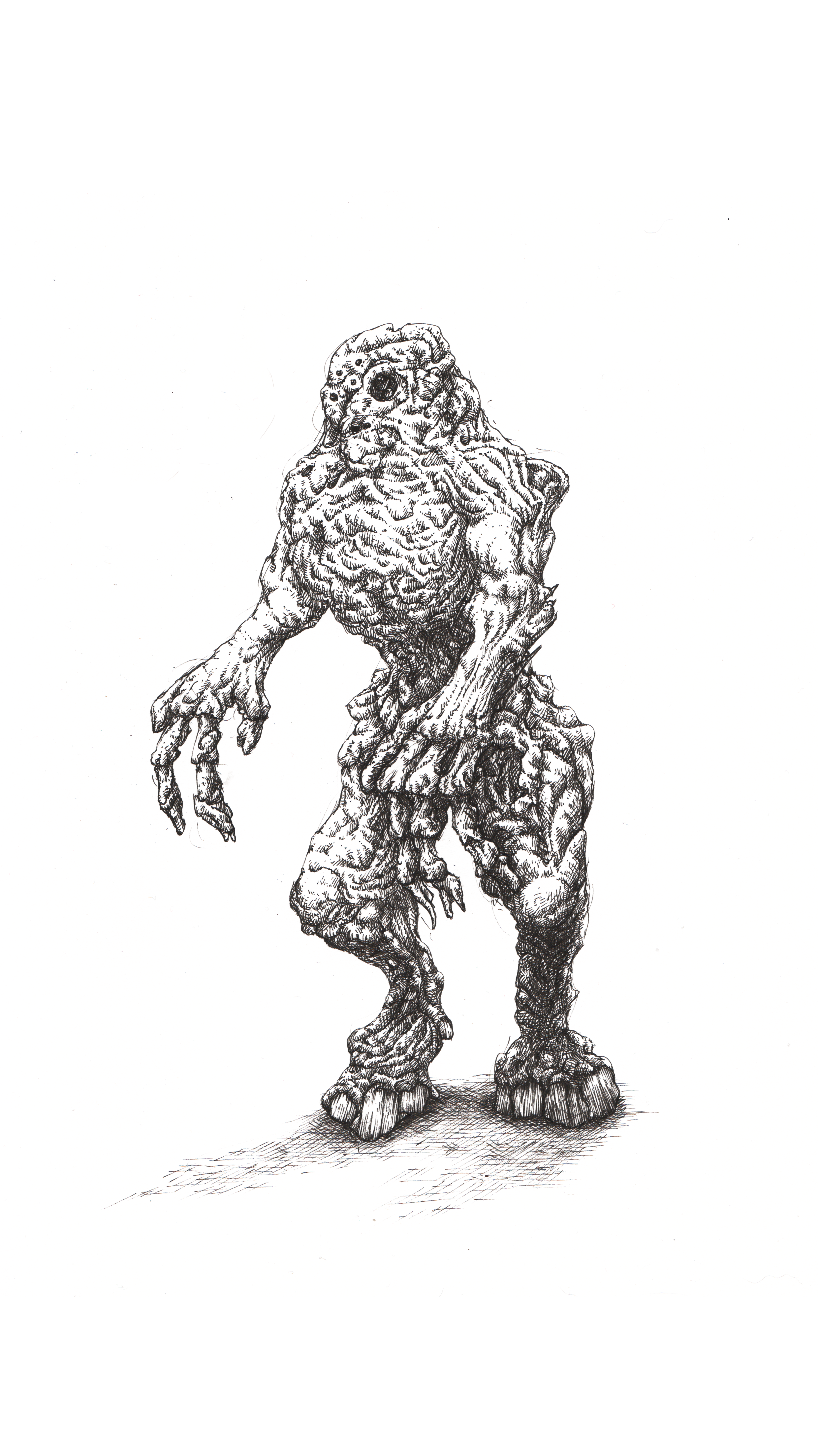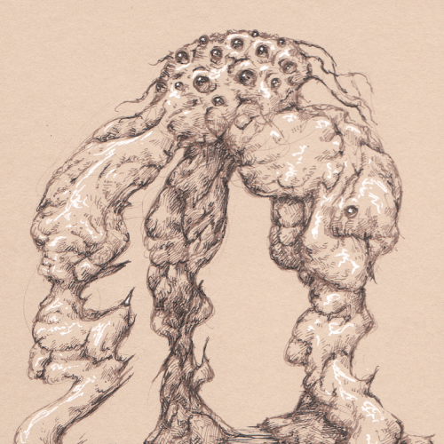 A quick semi automatic drawing that became more invested as I went. I started out with the intention to get at a vague humanoid form, but let it be lumpen and anatomically wrong. This guy was filled in in such a way as to make it believable as a form that could exist, even though the anatomy is very much non standard. 0.05 unipin on paper for this one. Bonus golem below that I wasn’t quite as happy with