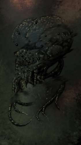 This was some decalcomania or marbling experiments that I scanned in and used as a framework for digital painting. Using the pre existing dark sections as shading or void lead to something nebula-like but with a grim pseudo-fleshy tone.