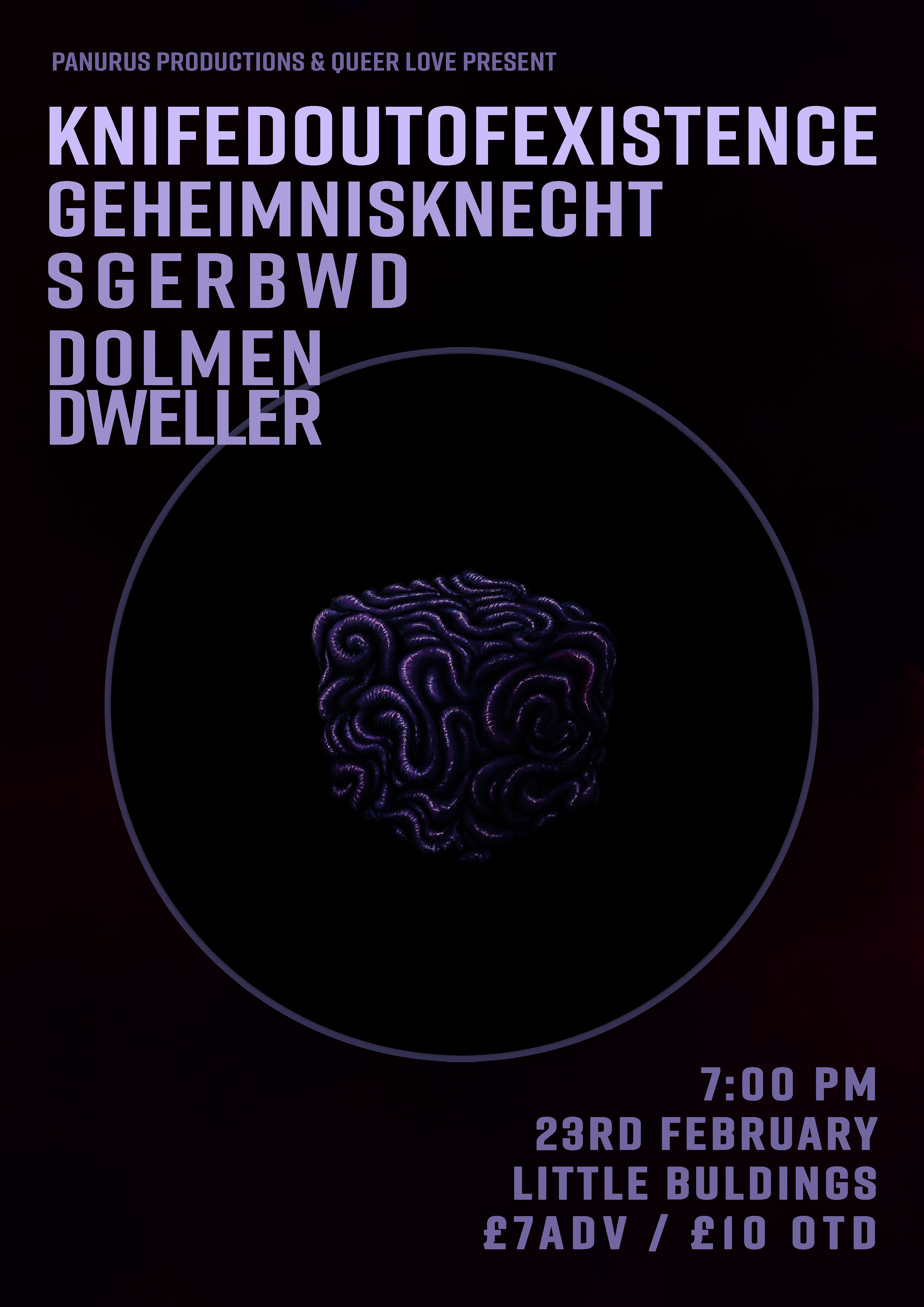 I wanted some kind of organic lament configuration for this, which fit the sonic tone pretty well I think. The idea had been floating in the back of my mind for a while and I wanted to try shaping organic worms/tendrils into something more angular. This the cube of tendrils held together I set it within some graphic elements and layered the act names over the top.