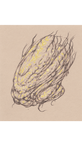 A quick excercise in inks. Automatic drawing in yellow ink, worked back into. Some kind of empty organic mech suit. Part of the regular ‘daily’ drawings I try to do, which you can find all of on my buymeacoffee page.