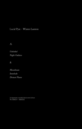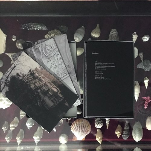 There was an aged cinematic quality to the Lucid Pyre material and I wanted to really ramp up the sort of decaying mansions and filigree element. To that end I set up the release across two cassettes in an debossed presentation box to make it feel more like an artefact. The debossed box (via Tiny Box Company) came with a set of presentation cards printed with a matte finish, giving glimpses of cropped cinematic stills to go with the isolated lyrics. Everything was kept specifically matte and grey for this, and even the kraft type card for the presentation box has its own kind of grain to it.