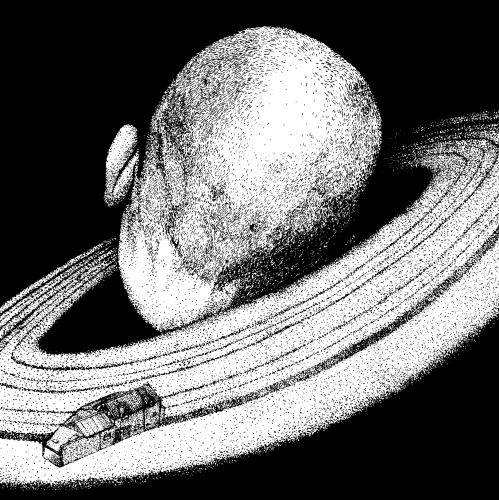 This was an idea based around Tim’s arachnophobia, and the resulting image is an accurate rendition of his head having sprouted spider-like legs. This was done in ink with dot work and printed in pale blue onto black T-shirts.