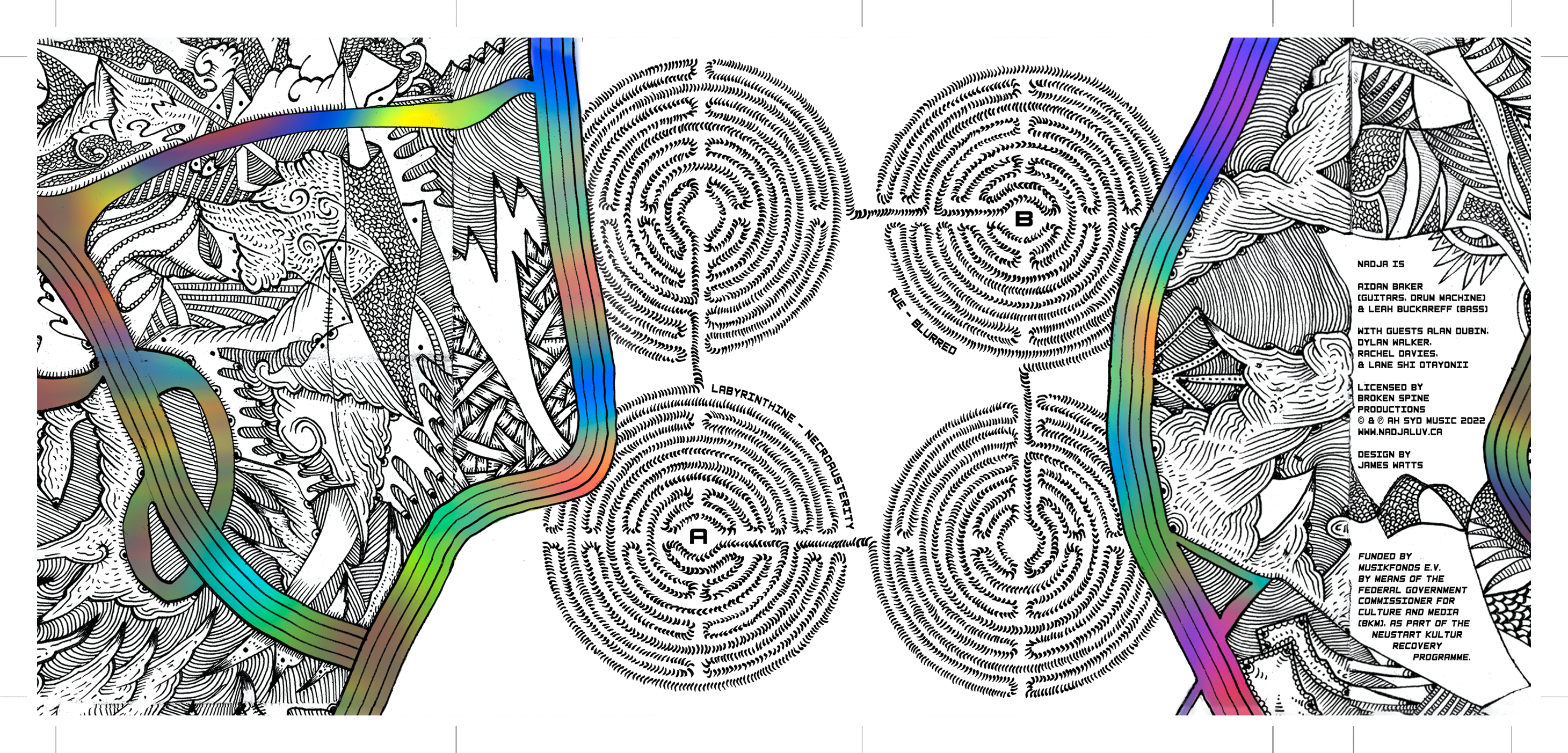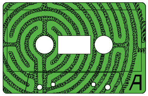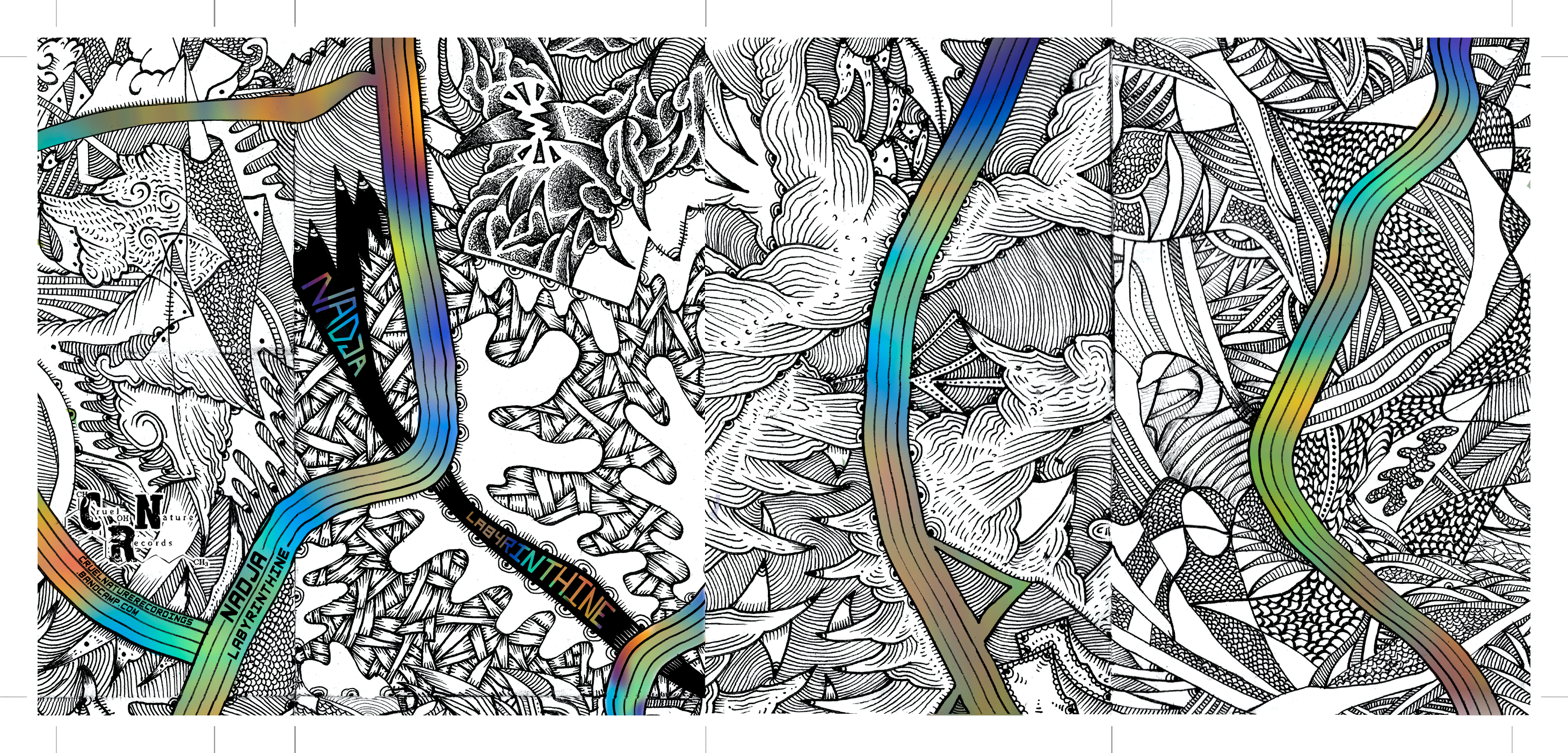 Labyrinthine was a special multi label release by one of my favourite bands featuring a bunch of my favourite vocalists, so it was a pretty big deal to get to set up the layouts. I wanted to include as much of the original art as possible as well as set the Cruel Nature run apart from the others; so a bit of snipping and rejigging of the layout so it flowed together on the landscape format of a cassette J-card. I also added in an oil slick kind of colour field to the striated sections and drew up some custom text for the cover, as well as tweaking the rest of the font to get it to sit within the design. The aim here was to embellish the art using the information that needed to be on the release so that it formed a coherent image for each face. I’m particularly happy with having the altered cover design open out onto the labyrinths inside.