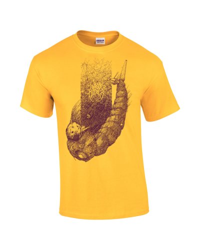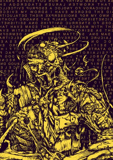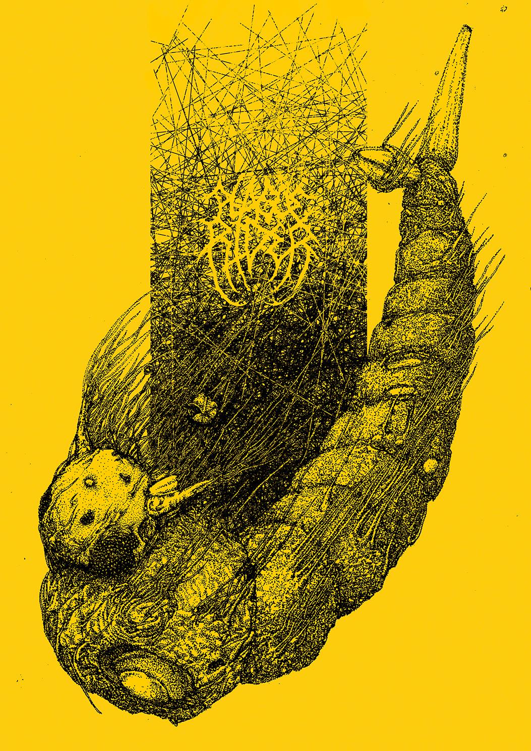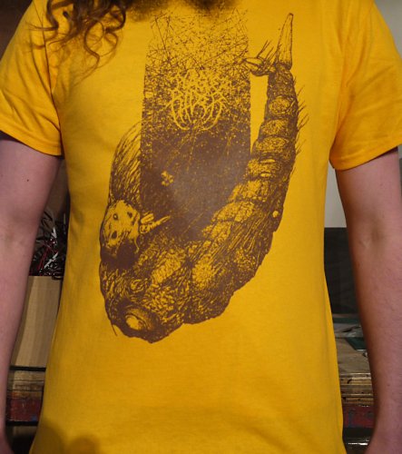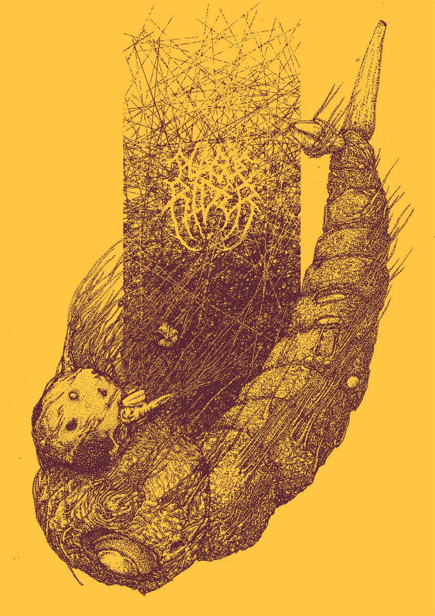 The design that started a thousand yellow shirts. This was either just before or just after we recorded Paroxysm and was drawn up in advance of the Plague Rider / Acatalepsy tour. The initial drawing was unipin on layout paper – a sort of mostly accurate mosquito larva that I embellished in the interest of shape and texture, with the latticework texture and logo cut from it done afterward in photoshop. In the process of putting this together I sat the image over a yellow background and realised it was a perfect fit. After much arguing we settled on a run of yellow T-shirts and they were probably the fastest selling merch we’ve made, to the point of producing a second run with a muddy crimson print on a more golden/peach yellow.