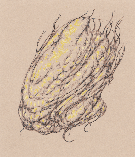 A quick exercise in inks on some really nice Claire Fontaine PaintOn card I was given. Automatic drawing of a fleshy seed pod type of structure with highlights added in white/yellow watercolour. Part of the regular drawings I try to do, which you can find all of on my buymeacoffee page.