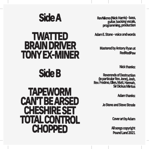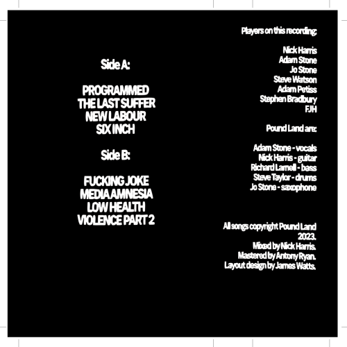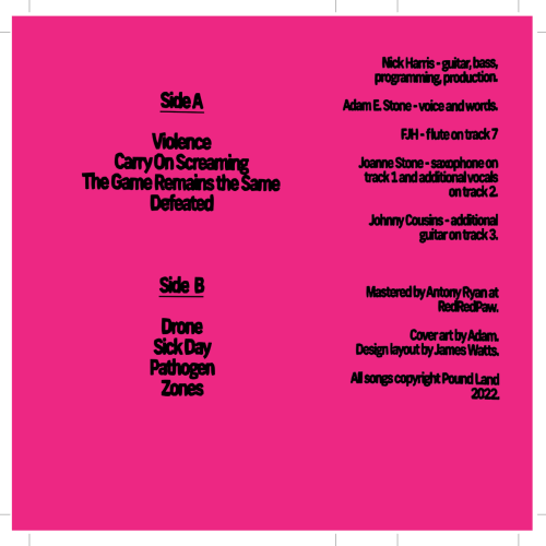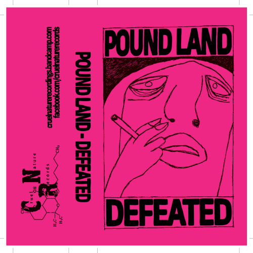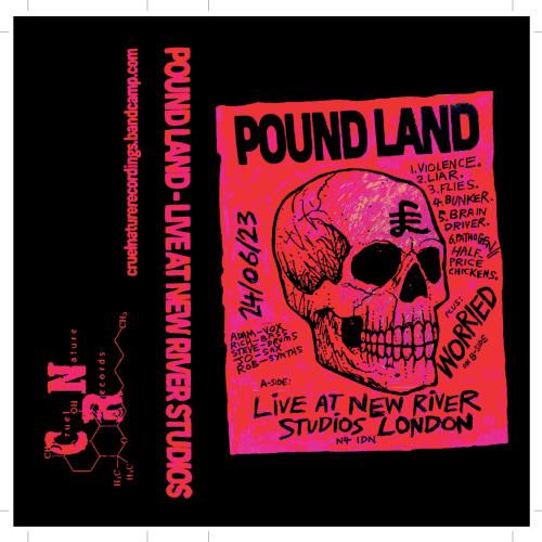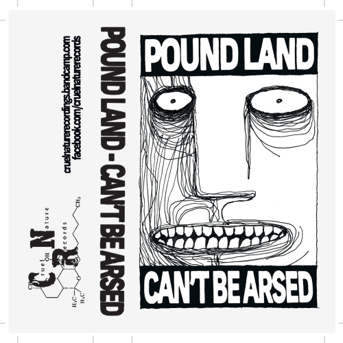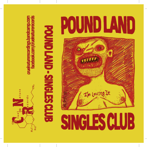 The first Pound Land layout I did came with a cover image with bars for the band name and album title included, but in a loose hand drawn way, and I wanted to keep that quality with the text on the release. What followed is a whole bunch of Pound Land layouts in with I set up the text as a normal font, and then set it the sections up as images, then low tolerance paths, and then warp them so that nothing is ever entirely straight. I use the same procedure on the smaller inlay text, but to a lesser degree. This has now become the consistent template, and I feel it keeps everything consistent with Adam’s art style, without losing the impact font, as well as working with the wonky dirge of the Pound Land music. This has become the consistent visual identity of the Pound Land stuff on Cruel nature and stands out nicely.