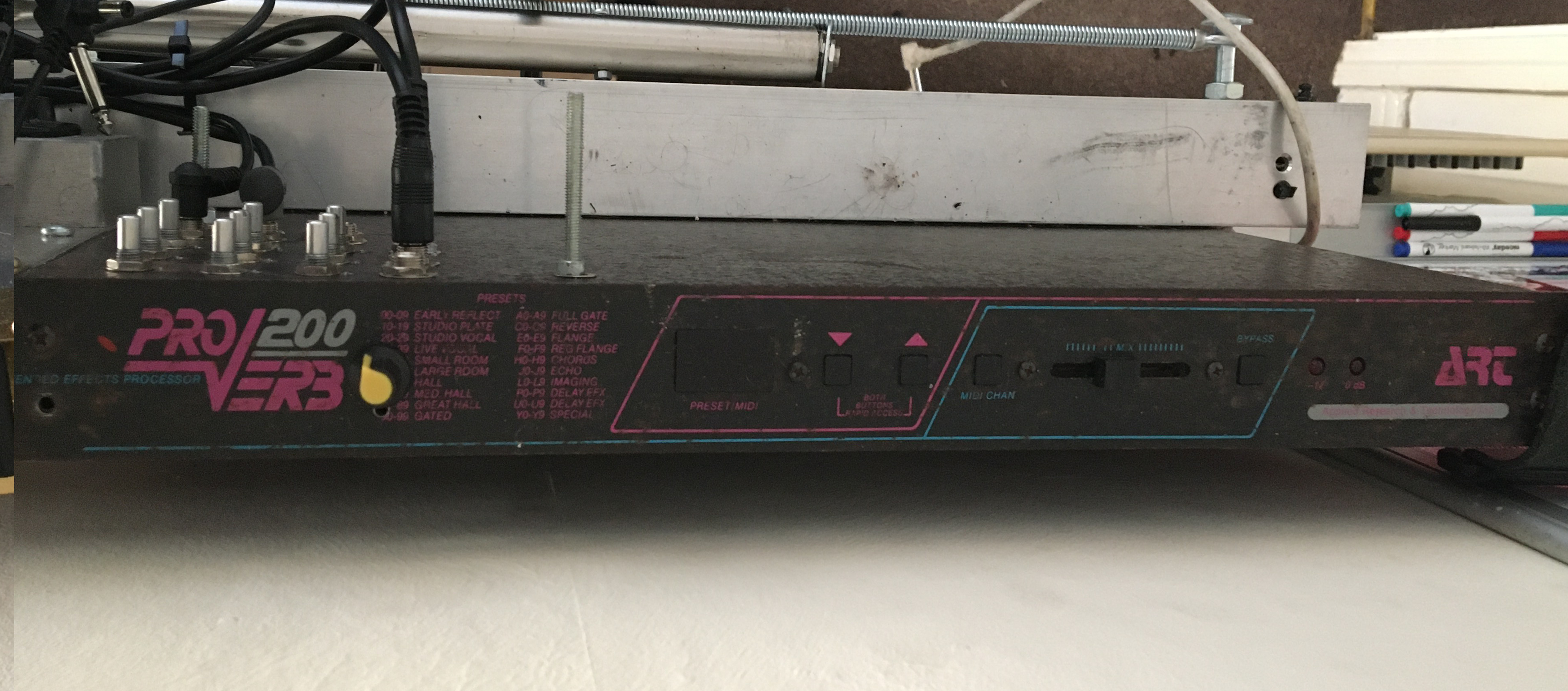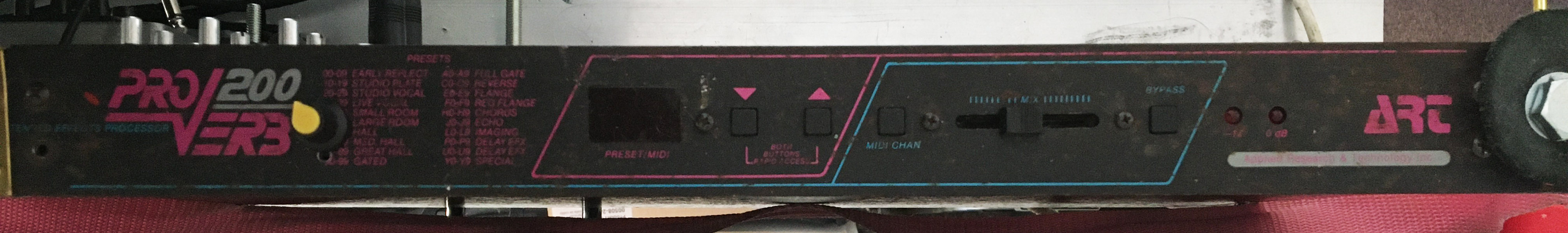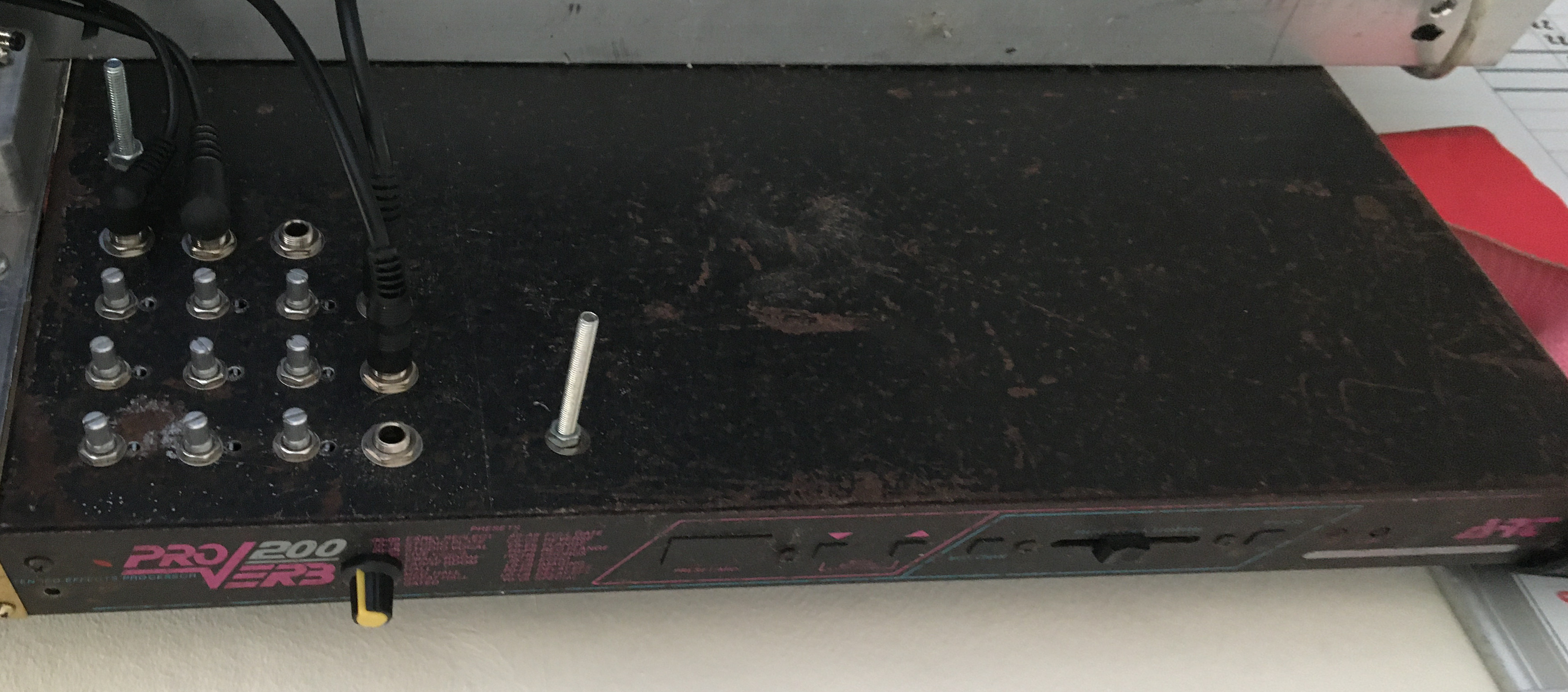 This is a modded old rack reverb unit, done with a chip and tutorial from CircuitBenders.co.uk. This thing was actually my first foray into vocal effects and what led to my liberal use of them ever since. Being an old rack unit, this had the big transformer built in and as this ended up as part of noise instrument that I would be holding, I didn’t fancy having mains voltage that close to my torso. So the first job was to remove and rewire the the transformer into an external block so that the operational power of the board was all that was going to where I’d be holding it.