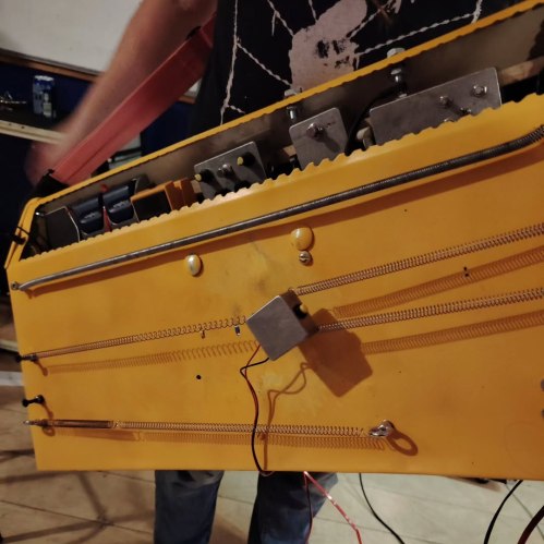 This is built from the shell of a radiator from the practice room, with the innards removed and various springs bolted to it. There are a couple of piezo pick ups bolted on there and a guitar pickup bolted into the base of it, with various options to run these together. Because of the sheet metal structure it’s particularly good/bad at feedback and at picking up any surface noise.
