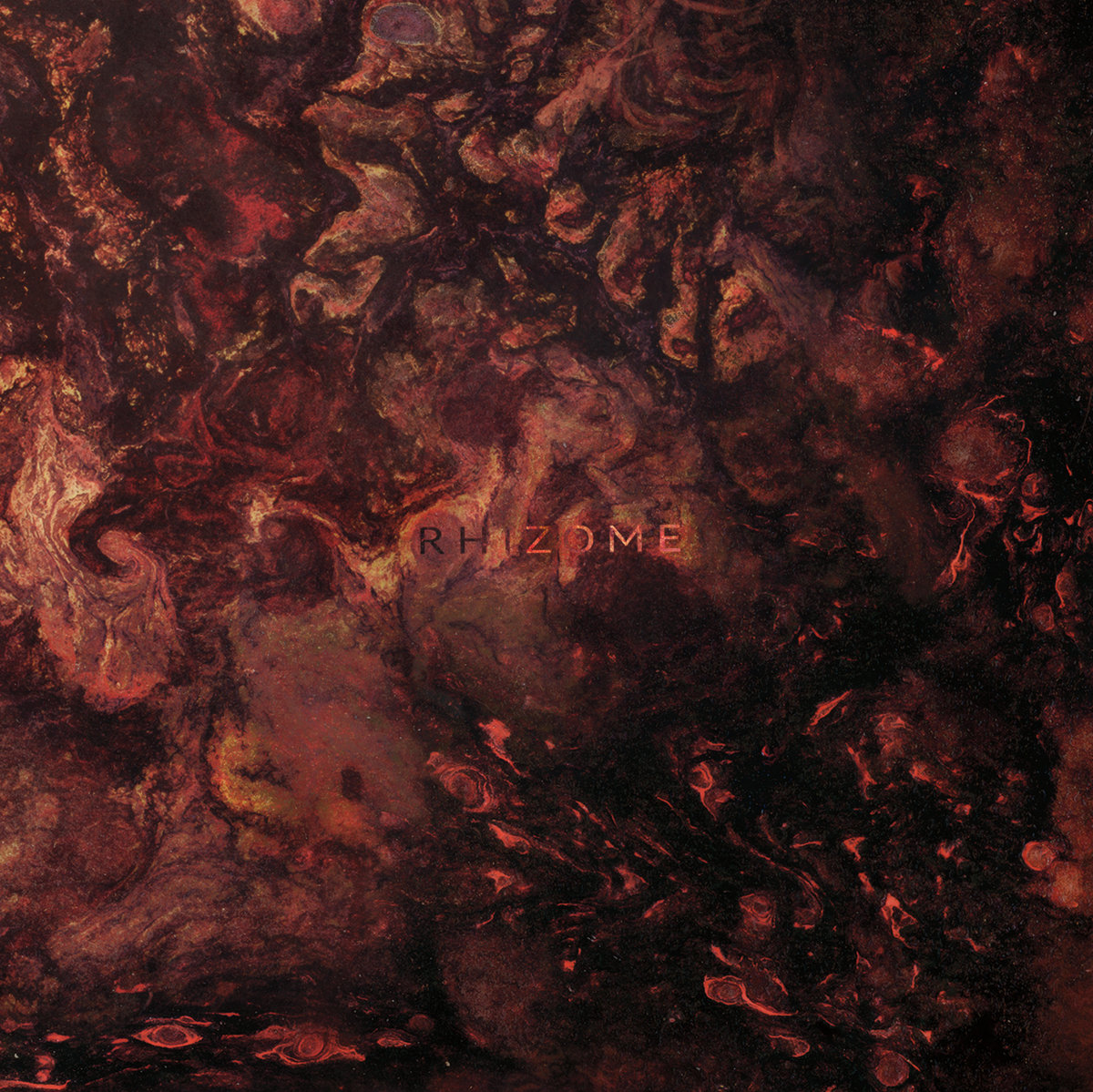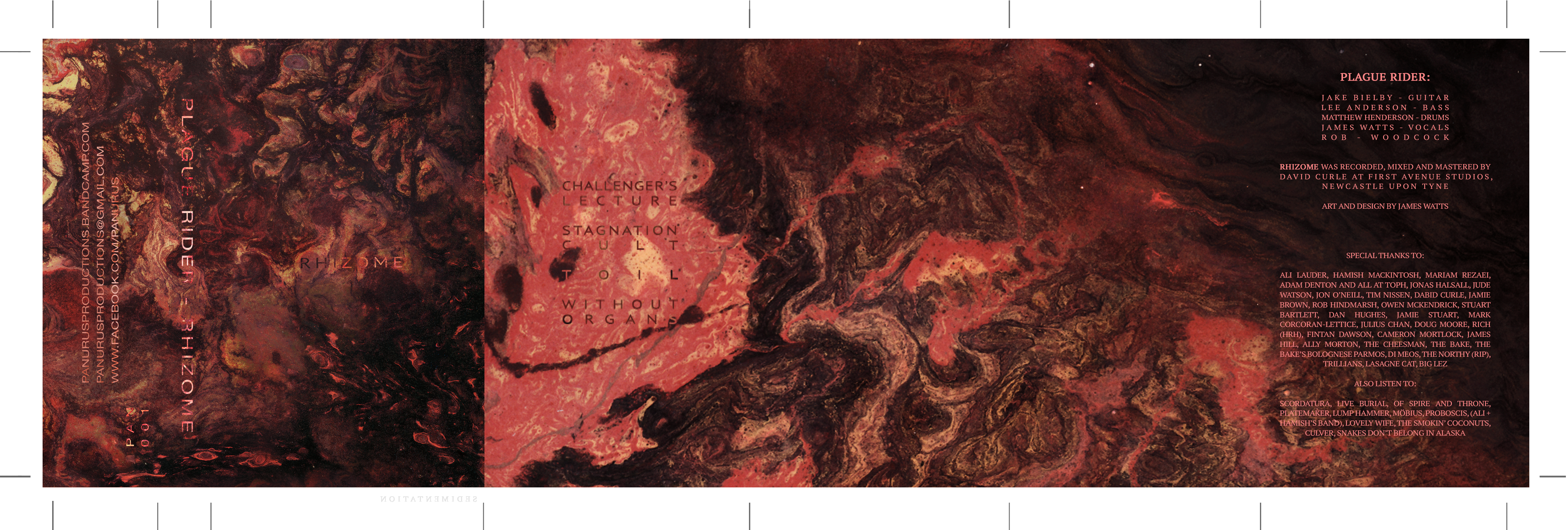 The art for Rhizome was very much a hybrid digital/analog creation. It’s quite hard to produce something that fits the Plague Rider material both musically and thematically, and all the more so because I’m in the band so there’s an extra layer of involvement and weight to it. For Rhizome I wanted something that fit with the shifting, warping quality of the music and reflected some kind of turbulence whilst keeping it pretty abstract; so I ended up pouring house paint tester pots and left over acrylics over boards in various different consistencies and angles to get at the textures, that I then scanned and overlayed digitally, yielding the images used for the release.