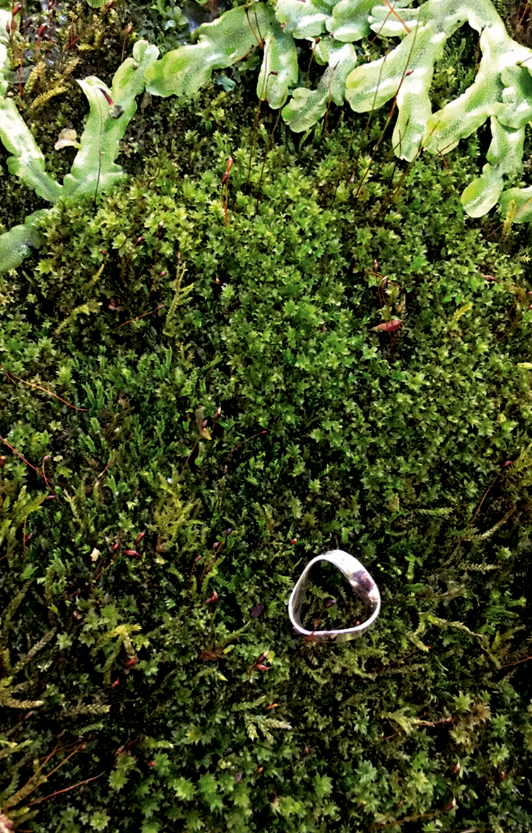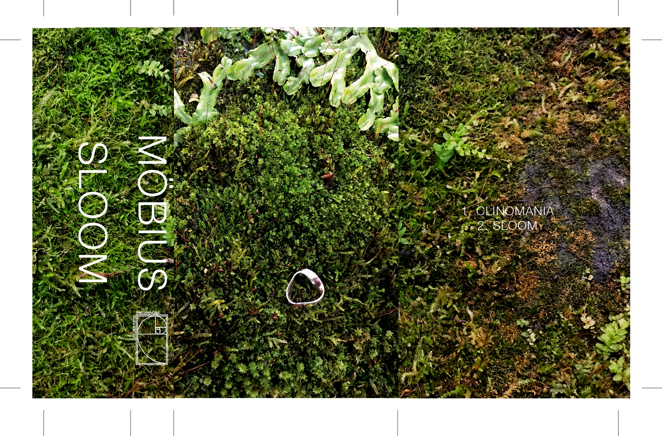 The images for this were taken at Edinburgh Royal Botanic Gardens. Sloom had a pretty verdant and mossy feel to it and I wanted to keep with the theme of featuring the Möbius strip in all the designs, so I photographed a silver Möbius strip made by Lucy Adlington in situ.
