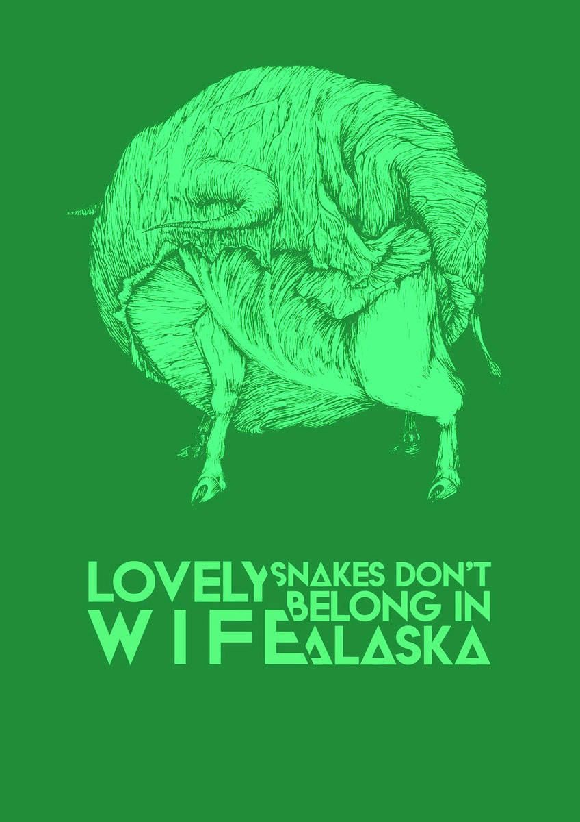 This was produced to coincide with the release of the Snakes Don’t Belong In Alaska / Lovely Wife split, and with a little run of dates we did around that. I think the image idea might actually have come before the T-shirt for this one – the idea of combining lettuce and cow emerged from sprouts I cast up to go with tape release and was too good to pass up.