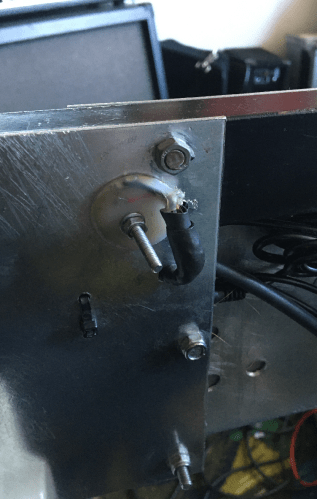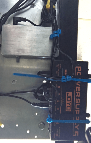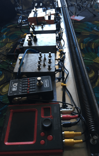 The core of the instrument is a couple of big springs bolted to a bit of scavenged metal. There’s a piezo bolted about halfway down the structure that then runs into an assortment of pedals. This has developed over time into a set up that includes a matrix mixer that means I can run two different chains of pedals and feed them back into each other; and an acoustic feedback box that allows me to run feedback scree through the plate at the bottom of the instrument. Various drilled holes, velcro, bolts and cable ties keep everything in place so I can thrash it about a bit while we’re playing.