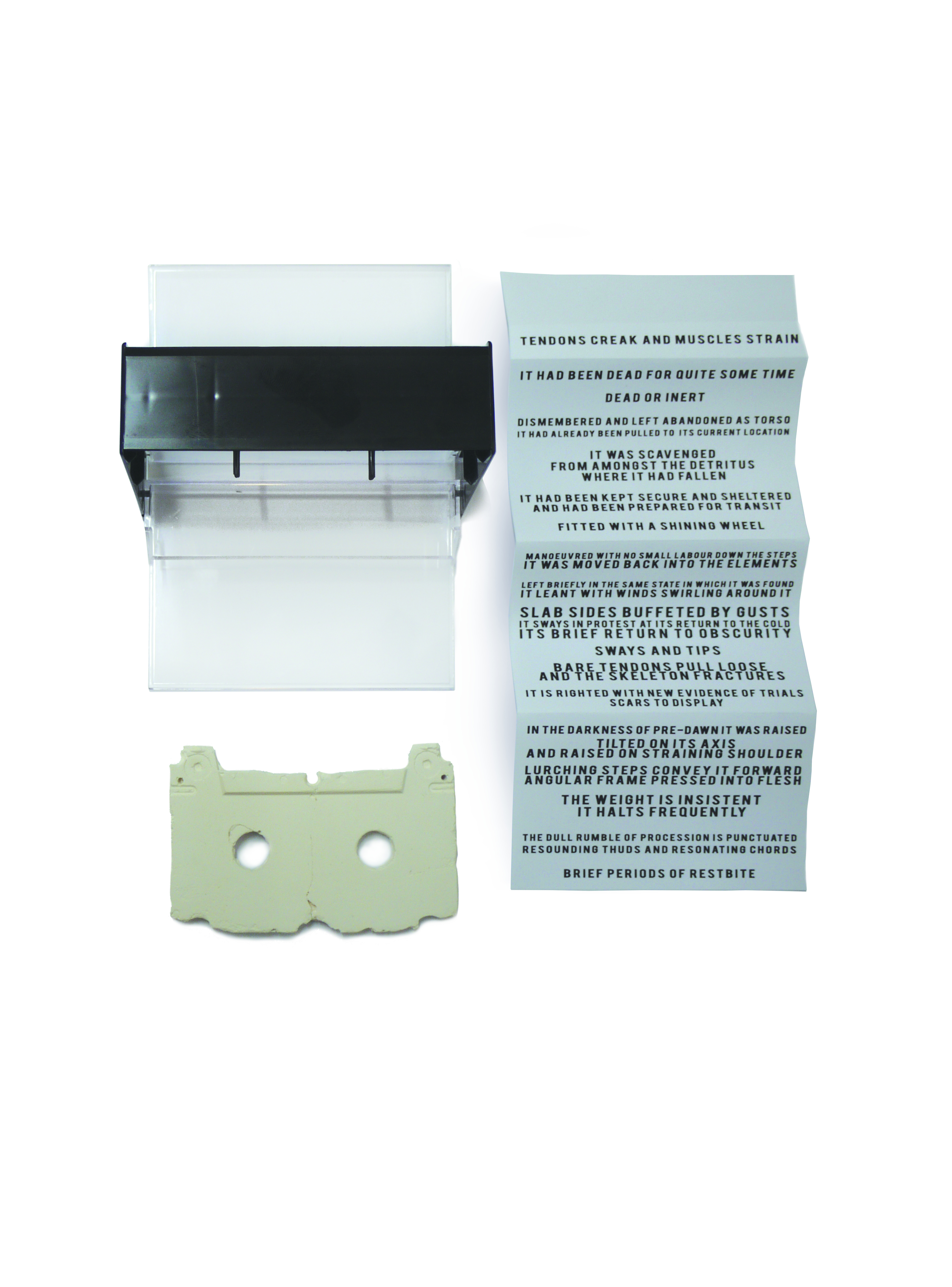 In a similar way, the plaster cast in the other side of the cassette case is taken from the innards of a cassette, and in its distressed and imperfect state represents a sort of skeleton, or fossil.