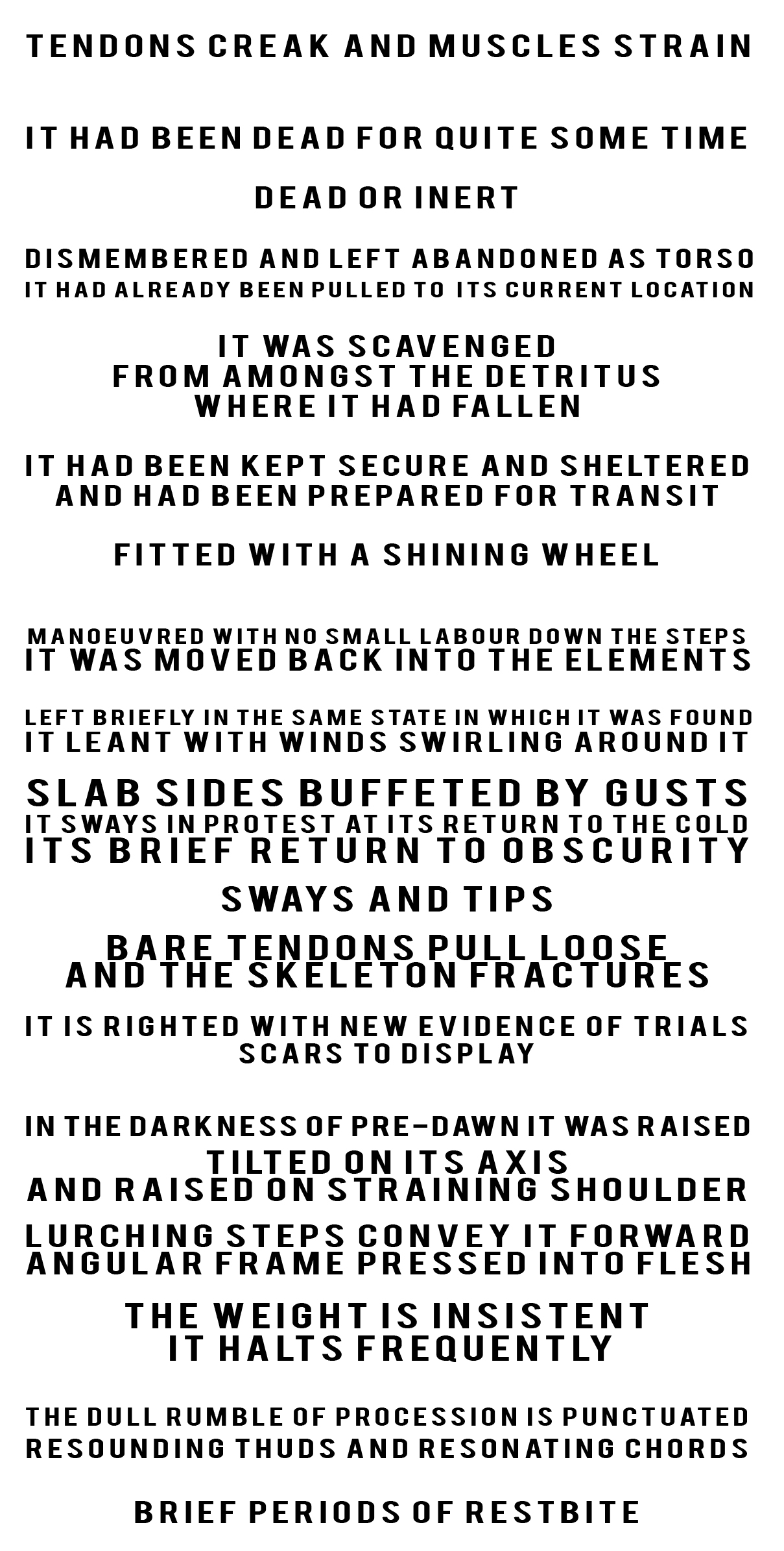 An edition of 25 of these were made as part of a run of boxes that went out with the There Were Islands exhibition. The lyrics are a description of a performance in which I dragged a chunk of piano some distance toward Baltic 39, where it would later be exhibited as Carcass. This was done in a sort of mythic Death Metal English tone which exaggerated the idea of the chunk of instrument as a body and blurred the line between the physical strain of moving it, and its own physical qualities.