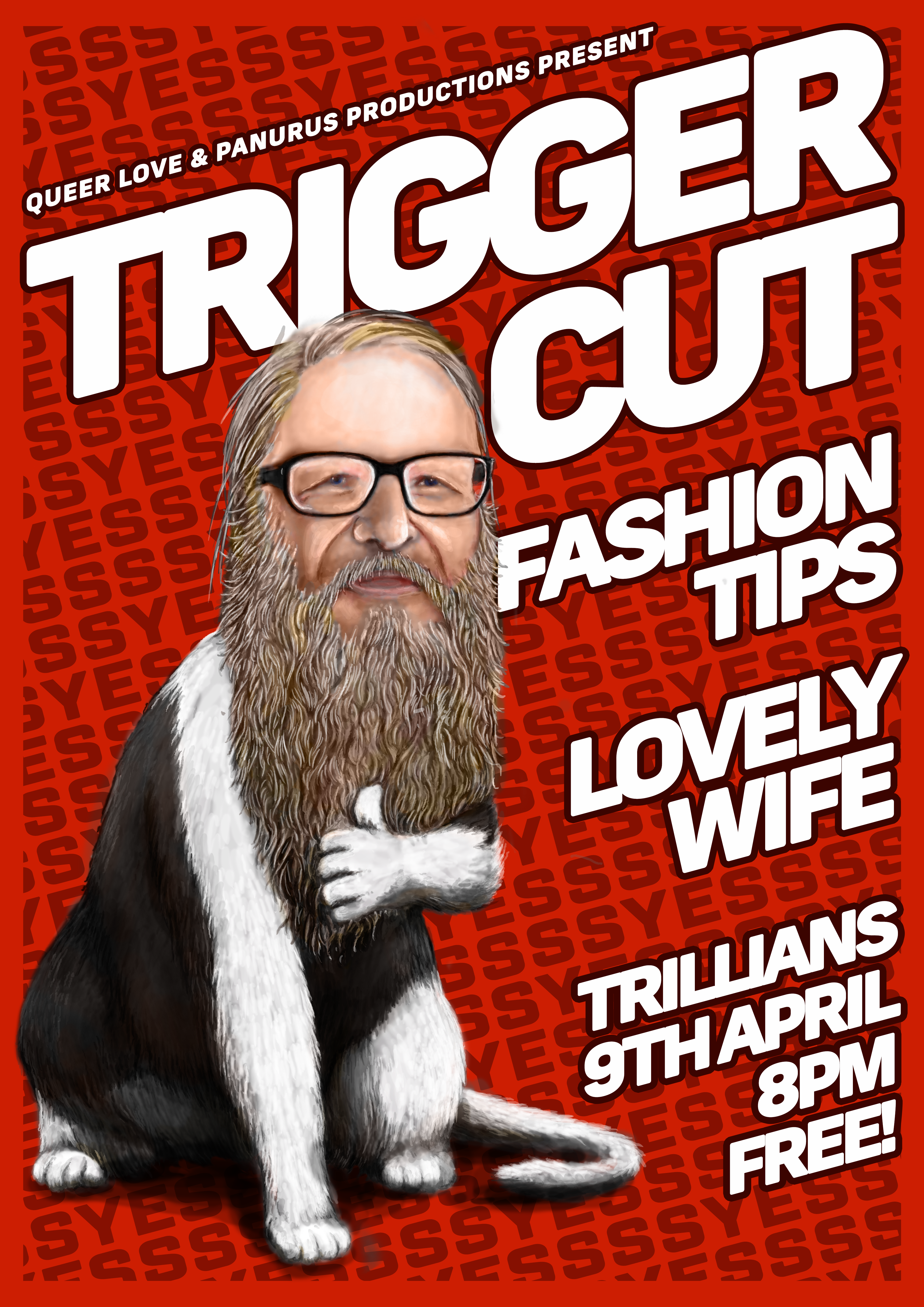 This was done for the ill fated ’23 Trigger Cut tour, that was cancelled by Brexit bureaucracy at the last minute. The initial design was based around Trigger Cut frontman, Ralph’s love of cats, and the word yes, combining the thumb cat gif and his face into one hybrid creature and using it at the main image. Good exercise in faces, which I generally tend to avoid. Slightly more cartoonish this one, but it fits the tone. When Trigger Cut were unable to get through we added Shan and I did a quick alteration on the poster, shown below the original.