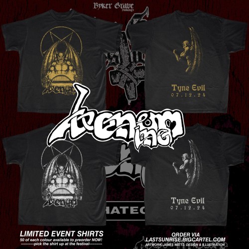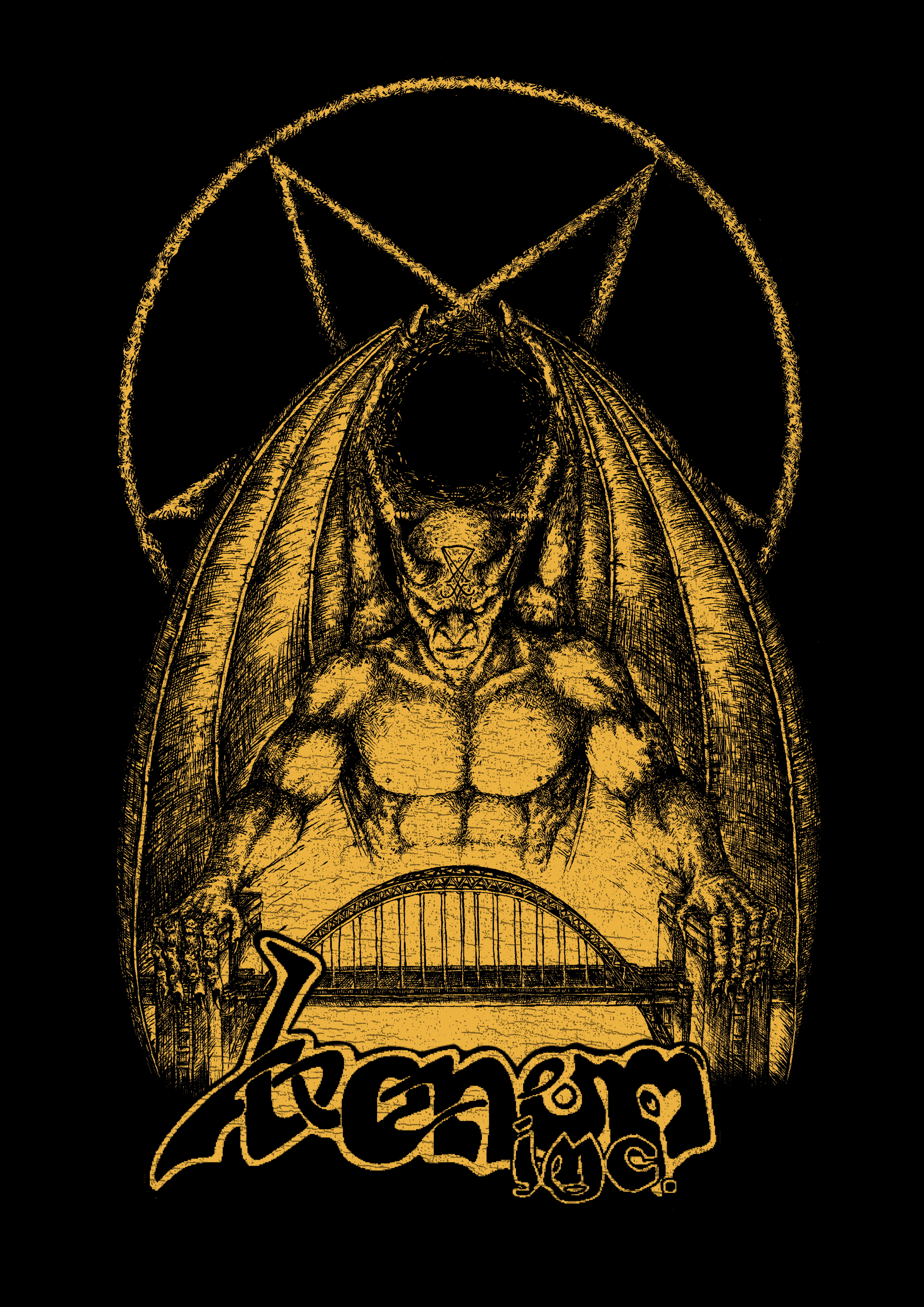 This was a design for a run of shirts for 2024 Byker Grave Festival,and the brief was to do something with the image of lucifer portrayed on the Avé album art, but also incorporate the Tyne Bridge. So with a bit (a lot) of artistic license taken with the scale and proportions of the bridge itself, I set up a version of lucifer looming over the landmark. I was asked to fill out the background once the main design was complete, so added in a pentagram with some kind of portal in the centre of it behind the big lad’s head. Human figure (albeit demonic in this case) isn’t necessarily my forté, so this was good practice and I think the source lighting from below came together nicely.